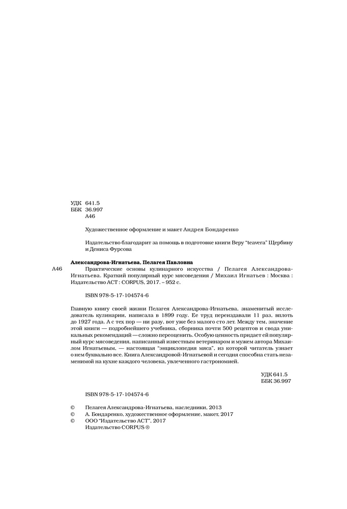 💳 Оплатить за товар можно при получении 🇰🇿 Есть бесплатная доставка по Казахстану 🎁 Копите бонусы с каждой покупки Переиздание легендарной книги по кулинарному искусству — подробнейшего учебника, сборника почти 500 рецептов и свода уникальных рекомендаций. С приложением краткого популярного курса мясоведения Михаила Игнатьева.Значение этой книги — подробнейшего учебника, сборника почти 500 рецептов и свода уникальных рекомендаций по кулинарному искусству — сложно переоценить. Особенно ценно то, что в нее входит популярный курс мясоведения, написанный известным ветеринаром Михаилом Игнатьевым, мужем Пелагеи Александровой-Игнатьевой. Его курс — это настоящая «энциклопедия мяса», из которой читатель узнает о нем буквально все. Впервые книга «Практические основы кулинарного искусства» вышла в 1932 году. Но так бывает, что старинное, пережившее время, вовсе не устаревает, а оказывается современнее всего. Именно это случилось и с книгой Александровой-Игнатьевой, которая и сегодня способна стать нужной и любимой на кухне каждого человека, увлеченного гастрономией.Об авторе:Пелагея Павловна Александрова-Игнатьева (1872-1953, Ленинград) — знаменитый исследователь и преподаватель кулинарии. После окончания поварской школы несколько лет работала под руководством таких кулинаров, как Ф. А. Зеест (член Парижской кулинарной академии) и Л. К. Астафьев (владелец паштетной мастерской).Пелагея Павловна была руководительницей практических занятий на поварских курсах, организованных ее мужем, — известным ветеринаром Михаилом Игнатьевым. В 1894-1896 годах публиковалась в журнале "Наша пища".Цитата:По сути дела, книги Пелагеи Павловны значили для нашей гастрономической культуры не меньше, если не больше творчества Е. Молоховец. Они продолжали одну из центральных идей нашей поварской мысли: гастрономия для повседневной жизни домашних хозяек, а не для дворцовых приемов...- Ольга и Павел Сюткины |
