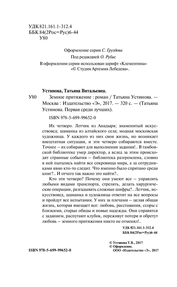 Земное притяжениеВ данный момент этот товар отсутствует в продаже. Возможно, у нас найдется аналогичный или похожий товар здесь. Серия: Татьяна Устинова. Первая среди лучших Их четверо. Летчик из Анадыря; знаменитый искусствовед; шаманка из алтайского села; модная московская художница. У каждого из них своя жизнь, но возникает внештатная ситуация, и эти четверо собираются вместе. Точнее – их собирают для выполнения задания!.. В тамбовской библиотеке умер директор, а вслед за этим происходят странные события – библиотека разгромлена, словно в ней пытались найти все сокровища мира, а за сотрудниками явно кто-то следит. Что именно было спрятано среди книг?.. И отчего так важно это найти?.. |