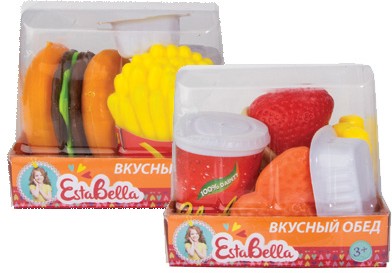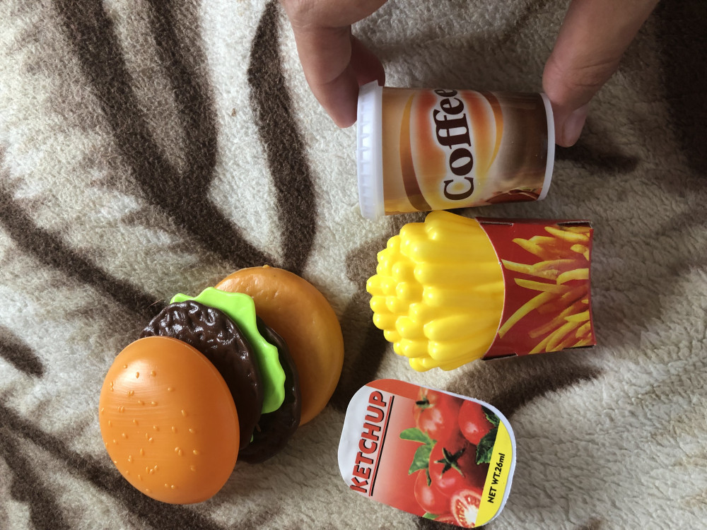 Комплект включает в себя игрушечные продукты питания, сделанные из пластика, а также вспомогательные предметы, вроде стаканчика для питья сока или упаковки от кетчупа.