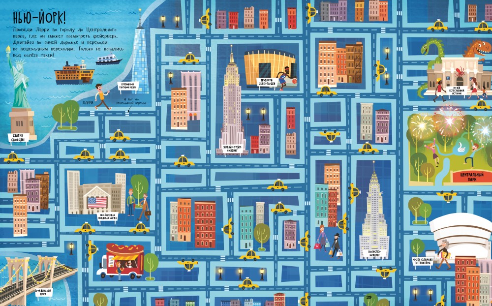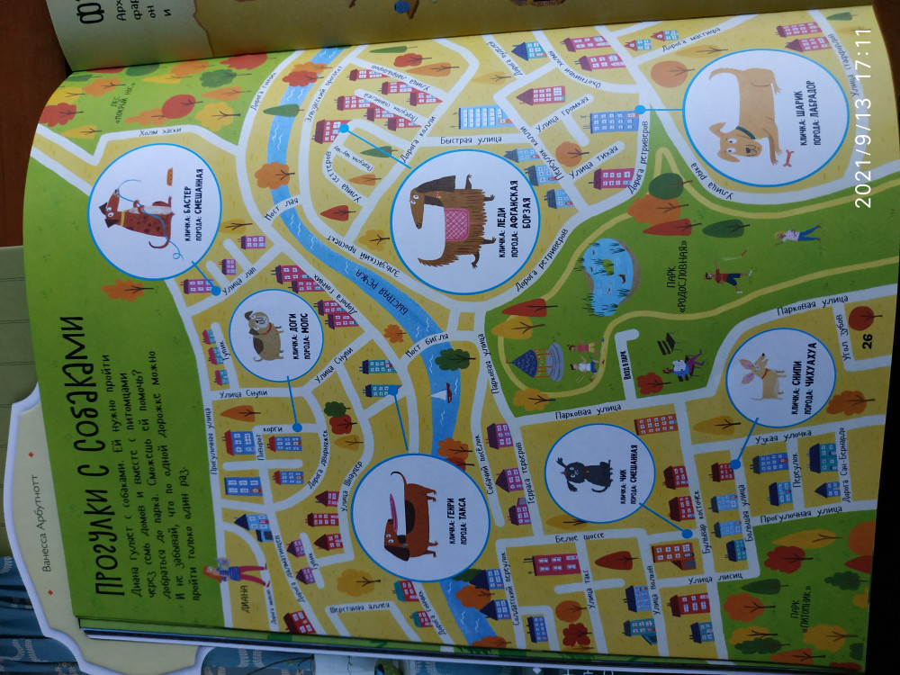 Очень красочная и яркая книжка. Подходит на возраст около 5-6 лет. Моему сыну 3,6 года))) немного сложновато для него. Но он все равно иногда берет маленькую машинку и водит по лабиринту в поисках выхода))