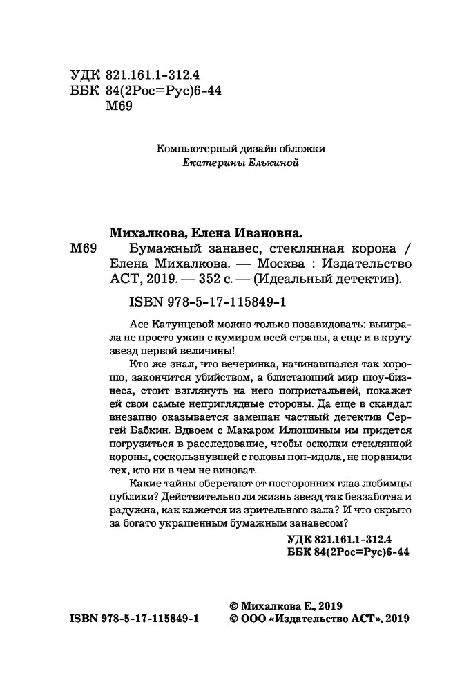 Бумажный занавес, стеклянная коронаВ данный момент этот товар отсутствует в продаже. Возможно, у нас найдется аналогичный или похожий товар здесь. Серия: Идеальный детектив Асе Катунцевой можно только позавидовать: выиграла не просто ужин с кумиром всей страны, а еще и в кругу звезд первой величины!Кто же знал, что вечеринка, начинавшаяся так хорошо, закончится убийством, а блистающий мир шоу-бизнеса, стоит взглянуть на него попристальней, покажет ей свои самые неприглядные стороны. Да еще в скандал внезапно оказывается замешан частный детектив Сергей Бабкин. Вдвоем с Макаром Илюшиным им придется погрузиться в расследование, чтобы осколки стеклянной короны, соскользнувшей с головы поп-идола, не поранили тех, кто ни в чем не виноват.Какие тайны оберегают от посторонних глаз любимцы публики? Действительно ли жизнь звезд так беззаботна и радужна, как кажется из зрительного зала? И что скрыто за богато украшенным бумажным занавесом? |