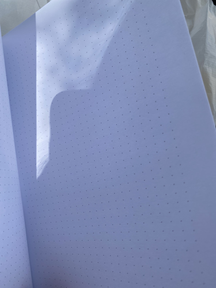 Пришел скетчбук без повреждений, немного замарали первую страницу, но не страшно. Состоит из пяти видов бумаг. Правда соотношение разное, примерно половина от всего скетчбука черная, бежевая и мелованная, остальное обычная бумага и бумага с точками.