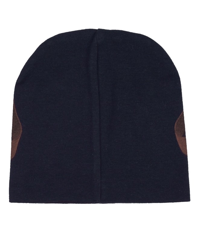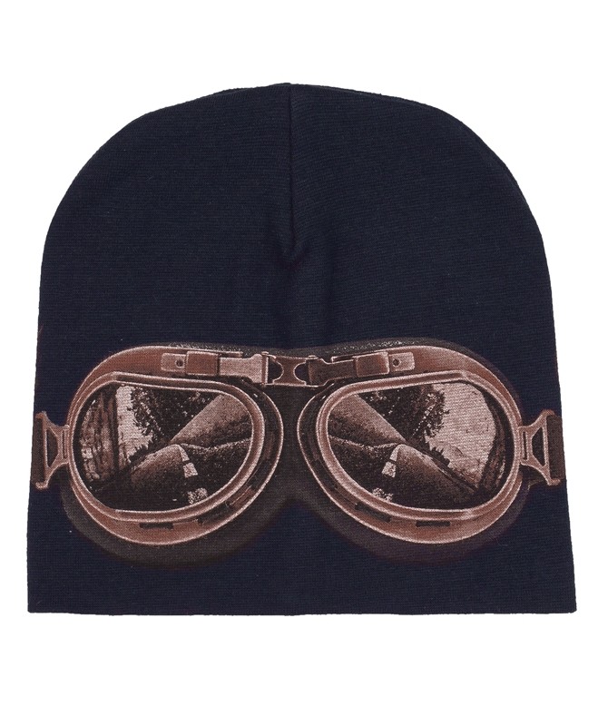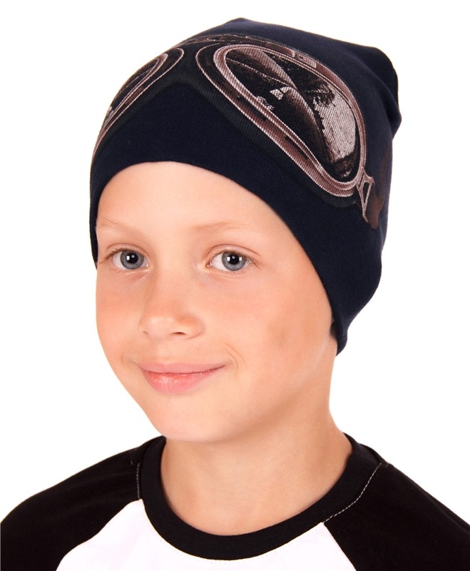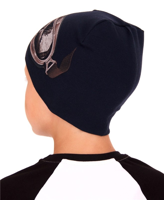 Фасон у шапочки очень хорошенький, сидит точь-в-точь как на фото, на окружность головы 53 см, 54 размер сел плотно, почти в обтяжку, трикотаж двуслойный, тонкий, в меру эластичный. Единственное, что немного расстроило - рисунок в виде очков - переводная картинка, которая уже после примерки слегка потрескалась по краям.