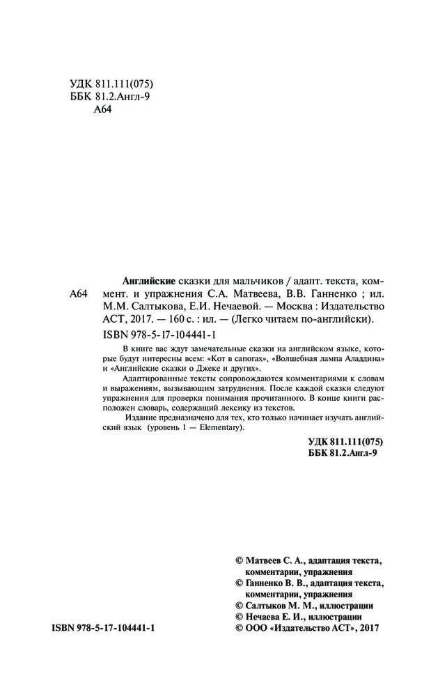 Английские сказки для мальчиков. Уровень 1В данный момент этот товар отсутствует в продаже. Возможно, у нас найдется аналогичный или похожий товар здесь. Серия: Легко читаем по-английски В книге вас ждут замечательные сказки на английском языке, которые будут интересны всем: «Кот в сапогах», «Волшебная лампа Аладдина» и "Английские сказки о Джеке и других".Адаптированные тексты сопровождаются комментариями к словам и выражениям, вызывающим затруднения. После каждой сказки следуют упражнения для проверки понимания прочитанного. В конце книги расположен словарь, содержащий лексику из текстов.Издание предназначено для тех, кто только начинает изучать английский язык (уровень 1 — Elementary). |