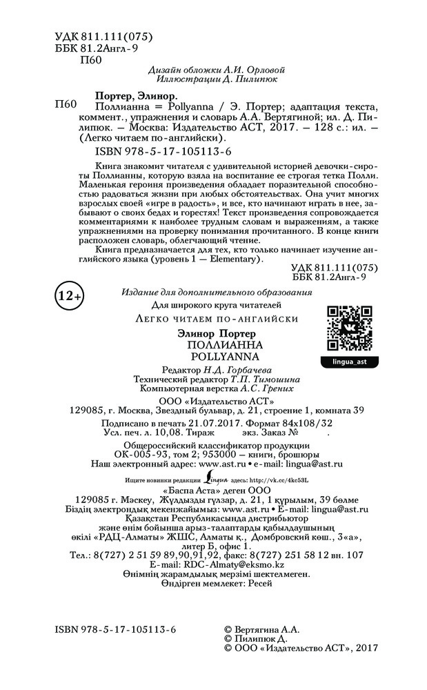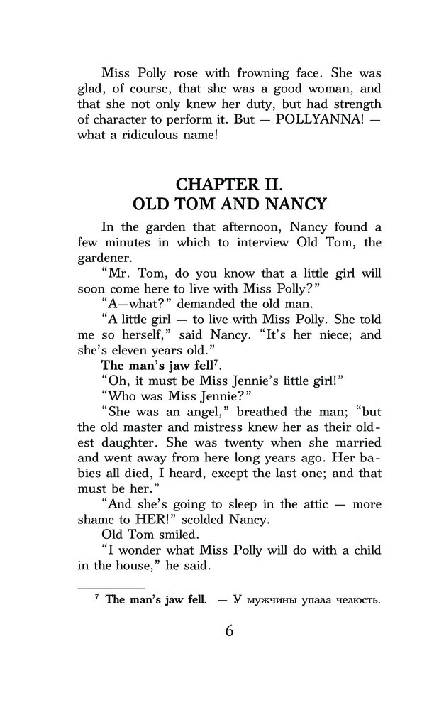 В данный момент этот товар отсутствует в продаже. Возможно, у нас найдется аналогичный или похожий товар здесь. Серия: Легко читаем по-английски Книга знакомит читателя с удивительной историей девочки-сироты Поллианны, которую взяла на воспитание ее строгая тетка Полли. Маленькая героиня произведения обладает поразительной способностью радоваться жизни при любых обстоятельствах. Она учит многих взрослых своей «игре в радость», и все, кто начинают играть в нее, забывают о своих бедах и горестях! Текст произведения сопровождается комментариями к наиболее трудным словам и выражениям, а также упражнениями на проверку понимания прочитанного. В конце книги расположен словарь, облегчающий чтение. Книга предназначается для тех, кто только начинает изучение английского языка (уровень 1 — Elementary). |