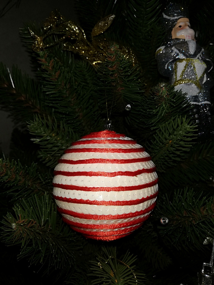 Шар действительно очень красивый: состоит из 2 рядов пайеток: из белых и красных. Очень красиво переливается. Намного красивее, чем на картинке. Действительно, я тоже пожалела что не заказала сразу 2 штуки.