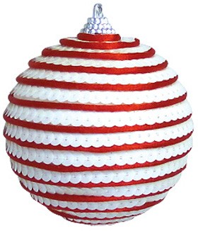 Праздничное украшение в стиле"Хай-тек" - выполнено в виде шарика с полосами красного и белого цветов. Белые полоски это пайетки, плотно приклеенные друг к другу. Игрушка смотрится очень оригинально и стильно. Увешанная такими шариками елка будет выглядеть со вкусом и по-настоящему превосходно.