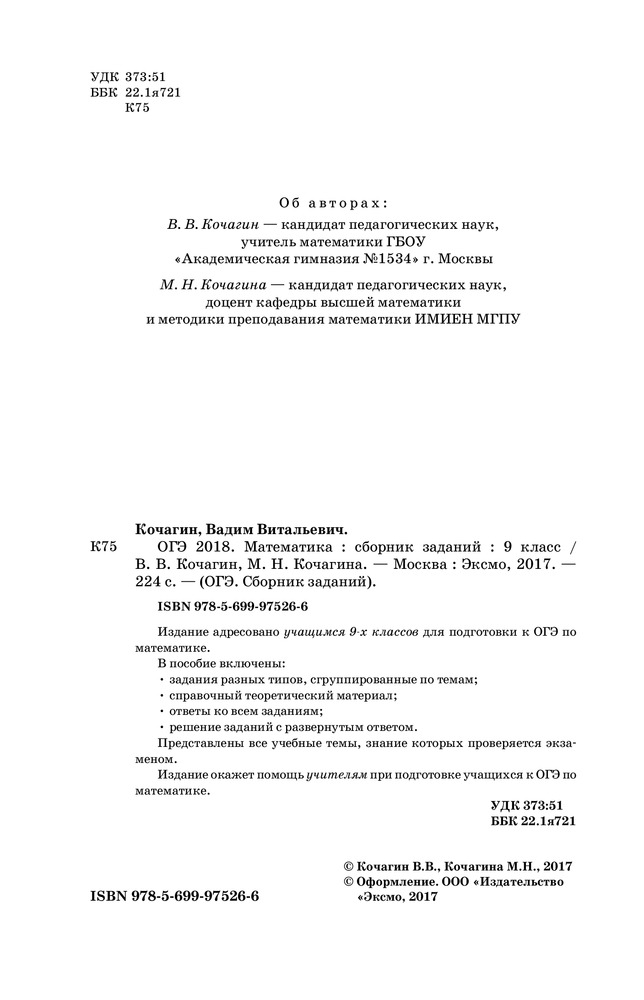 ОГЭ 2018. Математика. 9 класс. Сборник заданийВадим Витальевич Кочагин, Мария Николаевна Кочагина В данный момент этот товар отсутствует в продаже. Возможно, у нас найдется аналогичный или похожий товар здесь. Серия: ОГЭ. Сборник заданий (обложка) Издание адресовано учащимся 9-х классов для подготовки к ОГЭ по математике.В пособие включены:- задания разных типов, сгруппированные по темам; — справочный теоретический материал;- ответы ко всем заданиям; — решение заданий с развернутым ответом. Представлены все учебные темы, знание которых проверяется экзаменом.Издание окажет помощь учителям при подготовке учащихся к ОГЭ по математике.Для среднего школьного возраста. |
