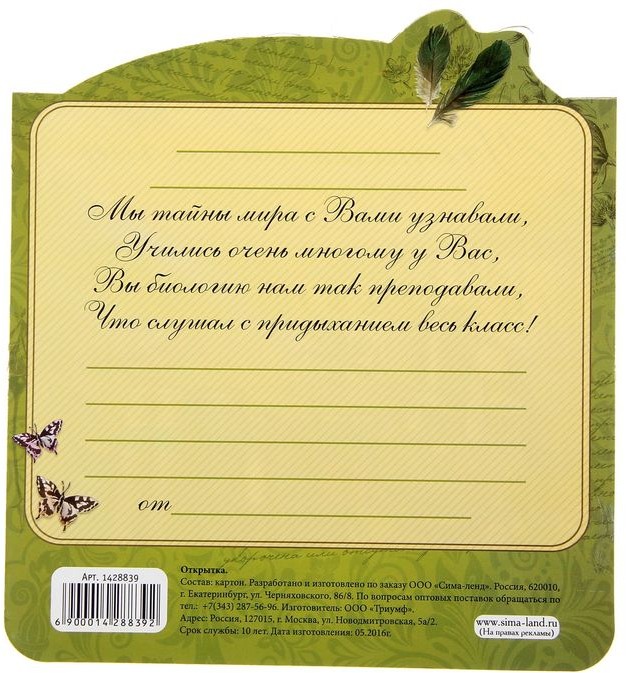Открытка «Учителю биологии»В данный момент этот товар отсутствует в продаже. Возможно, у нас найдется аналогичный или похожий товар здесь. Размер: квадрат. |