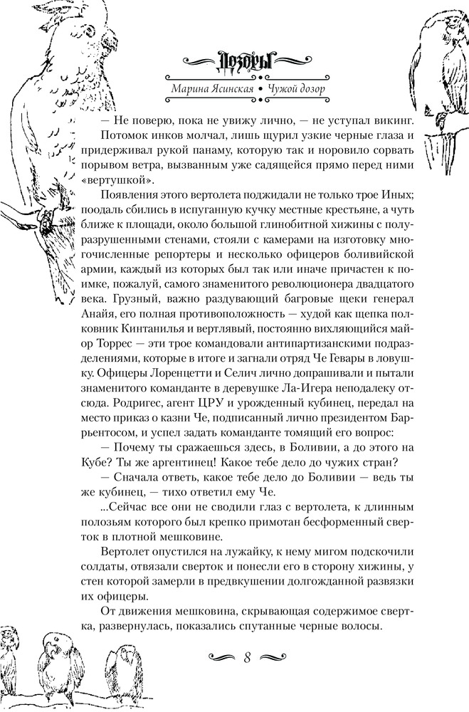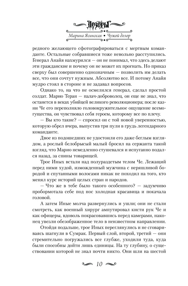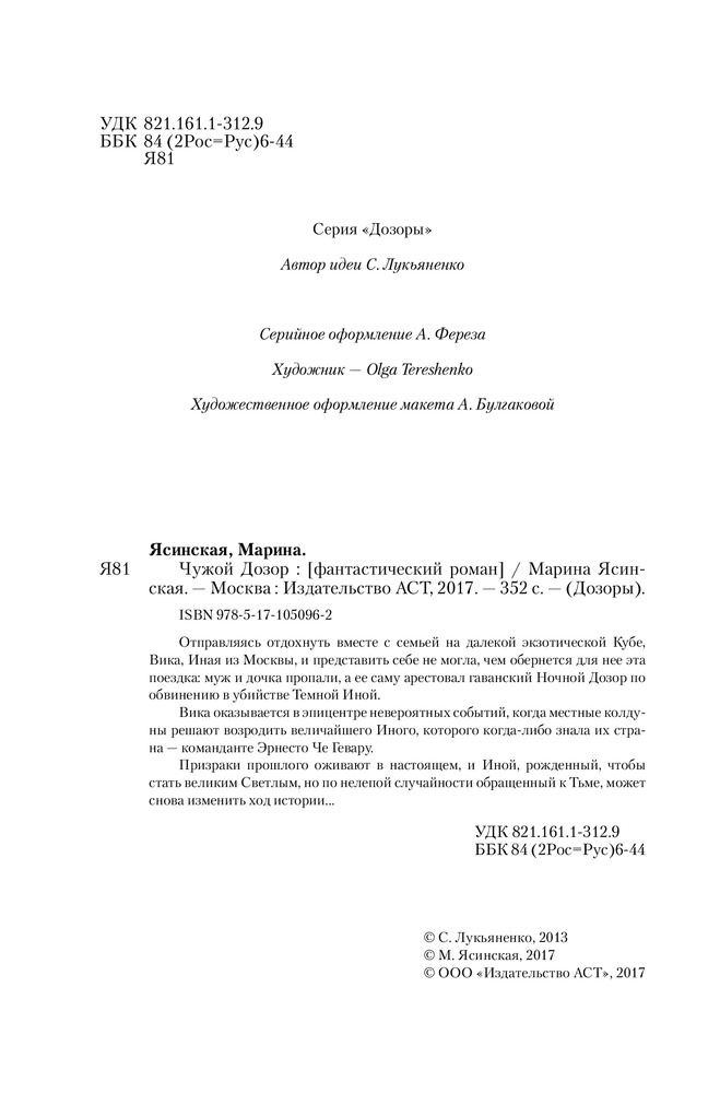 Оформление, печать, доставка - отлично. Содержание странное , то ли фантастика, то ли жизнеописание Че Гевары. Чужого дозора нет и в помине, имелось ввиду совместное дежурство темных и светлых. Звёзды поставила за оформление.