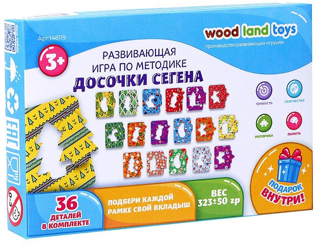 WoodLandToys Рамка - вкладыш «Доски Сегена 1»В данный момент этот товар отсутствует в продаже. Возможно, у нас найдется аналогичный или похожий товар здесь. Серия: Доски Сегена Доска Сегена (Seguin Form Board) — методика исследования уровня умственного развития детей, предложена Э. Сегеном в 1866 году. Материал методики включает 5 досок с врезанными в них фигурами. Испытуемому предлагается внимательно рассмотреть доску (в течение 10 с), после чего доска переворачивается, выпавшие из соответствующих гнезд фигурки или детали перемешиваются. Испытуемого просят уложить все фигуры на прежнее место. Время выполнения хронометрируется. |