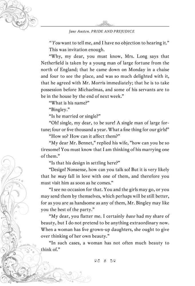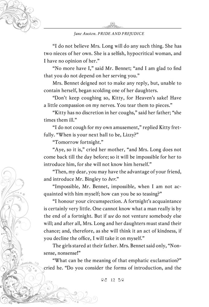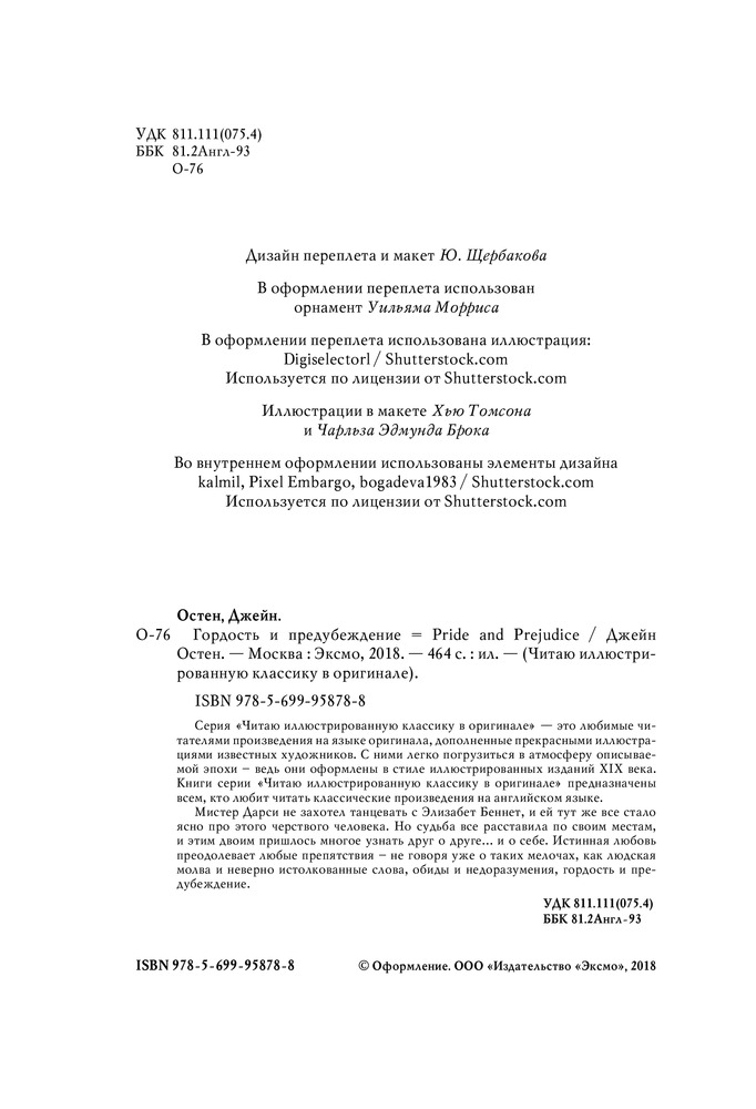 Pride and PrejudiceВ данный момент этот товар отсутствует в продаже. Возможно, у нас найдется аналогичный или похожий товар здесь. Серия: Читаю иллюстрированную классику в оригинале Серия «Читаю иллюстрированную классику в оригинале» — это любимые читателями произведения на языке оригинала, дополненные прекрасными иллюстрациями известных художников. С ними легко погрузиться в атмосферу описываемой эпохи — ведь они оформлены в стиле иллюстрированных изданий XIX века. Книги серии «Читаю иллюстрированную классику в оригинале» предназначены всем, кто любит читать классические произведения на английском языке.Мистер Дарси не захотел танцевать с Элизабет Беннет, и ей тут же все стало ясно про этого черствого человека. Но судьба все расставила по своим местам, и этим двоим пришлось многое узнать друг о друге... и о себе. Истинная любовь преодолевает любые препятствия — не говоря уже о таких мелочах, как людская молва и неверно истолкованные слова, обиды и недоразумения, гордость и предубеждение. |