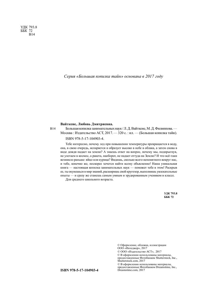 Большая копилка занимательных наукВ данный момент этот товар отсутствует в продаже. Возможно, у нас найдется аналогичный или похожий товар здесь. Серия: Большая копилка тайн Тебе интересно, почему лед при повышении температуры превращается в воду, она, в свою очередь, испаряется и образует высоко в небе в облака, а затем снова в виде дождя падает на землю? А знаешь ответ на вопрос, почему мы, подпрыгнув, не улетаем в космос, а ракета, наоборот, не падает оттуда на Землю? И что всё-таки возникло раньше: яйцо или курица? Видишь, сколько всего непонятного вокруг нас, и тебе, конечно же, поскорее хочется найти всему объяснение! Наша уникальная книга – настоящая копилка занимательных наук – поможет тебе в этом! Раскрыв ее, ты окунешься в мир знаний, расширишь свой кругозор, выполнишь увлекательные опыты – и сразу же станешь самым умным и эрудированным учеником в классе. |