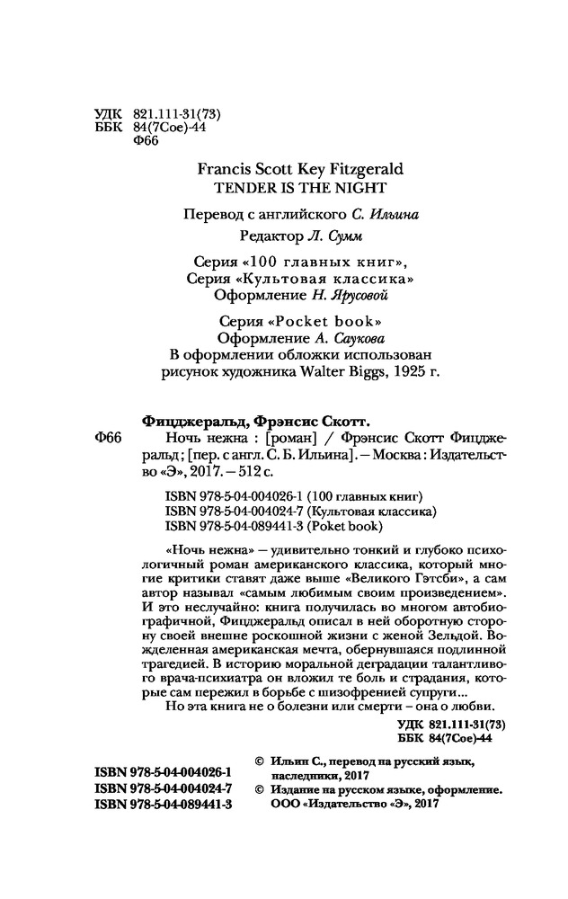В данный момент этот товар отсутствует в продаже. Возможно, у нас найдется аналогичный или похожий товар здесь. Серия: Pocket Book (обложка) «Ночь нежна» - удивительно тонкий и глубоко психологичный роман американского классика, который многие критики ставят даже выше «Великого Гэтсби», а сам автор называл «самым любимым своим произведением». И это неслучайно: книга получилась во многом автобиографичной, Фицджеральд описал в ней оборотную сторону своей внешне роскошной жизни с женой Зельдой. Вожделенная американская мечта, обернувшаяся покнигаой трагедией. В историю моральной деградации талантливого врача-психиатра он вложил те боль и страдания, которые сам пережил в борьбе с шизофренией супруги…