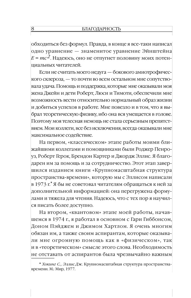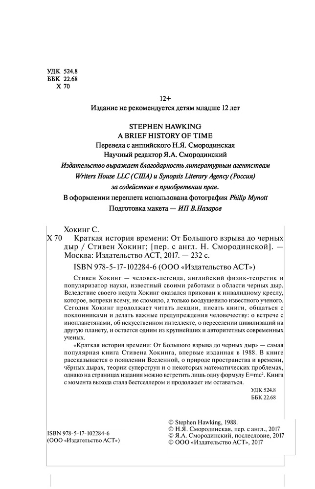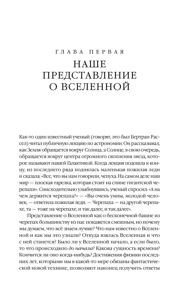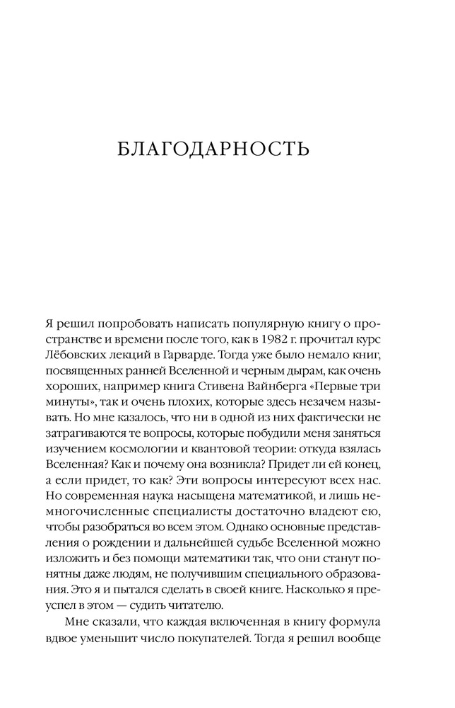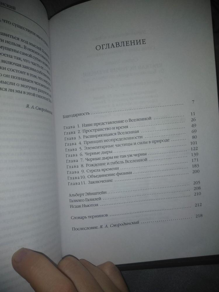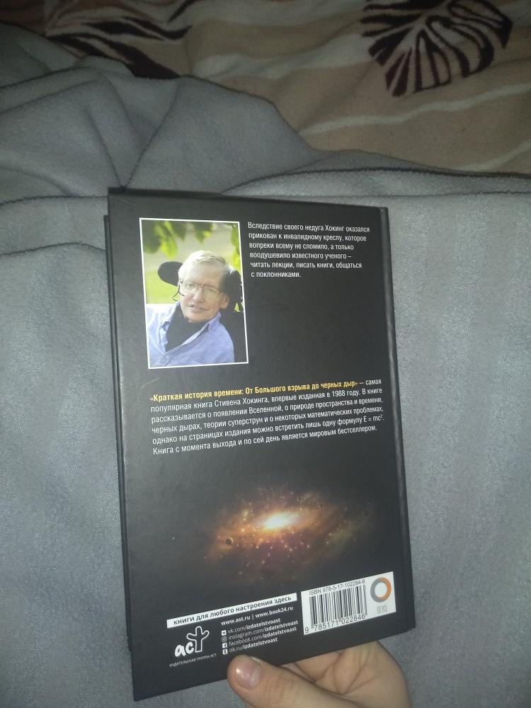 Книга потрясающая. Обложка красивая, страницы такие плотные, что я, сначала, думала что склеились))). Внешне, конечно, вообще прекрасна, но и внутри не хуже. Хокинг очень легко объясняет даже тем, кто далеко не астрофизик. Книга стоит своих денег. Если вы, как и я, интересуетесь бесконечной вселенной, но не понимаете научных жаргонов, то вам будет интересно.😊 Спасибо, как всегда, флипу за своевременную доставку. Вы самые лучшие.😘