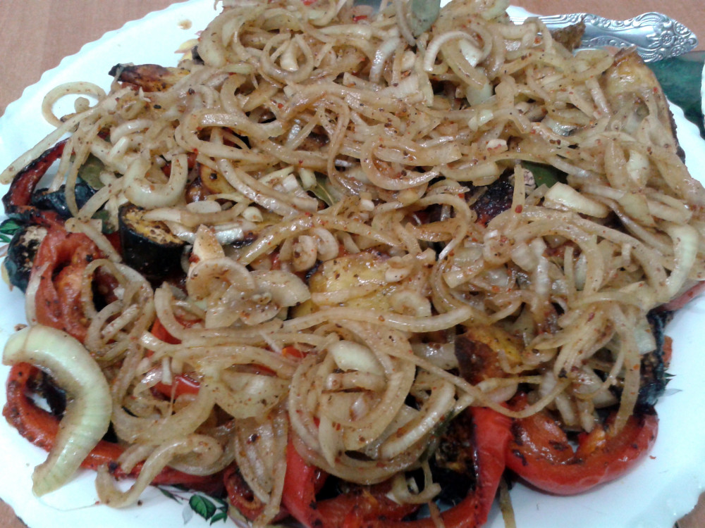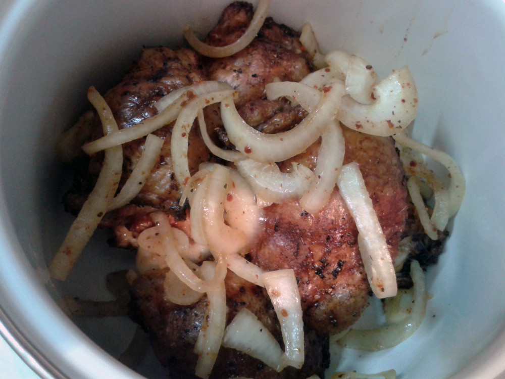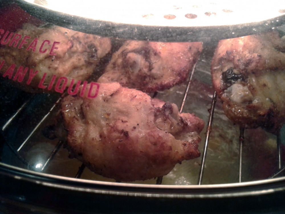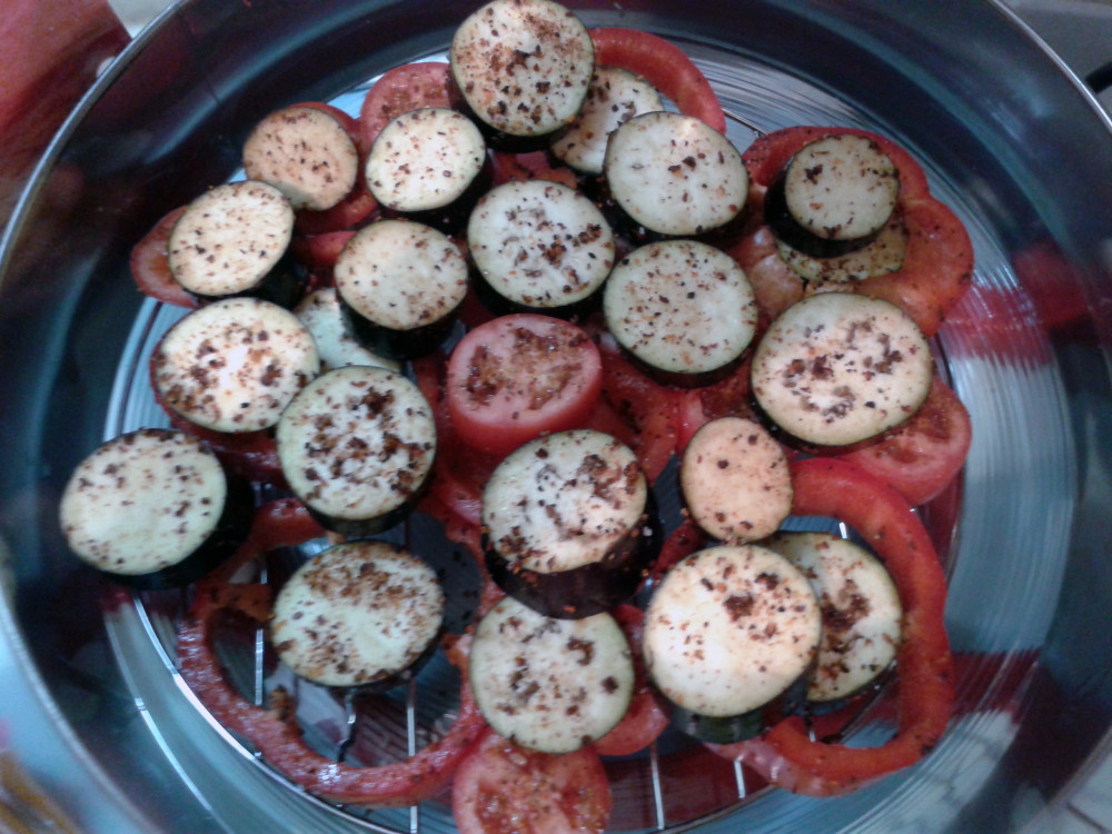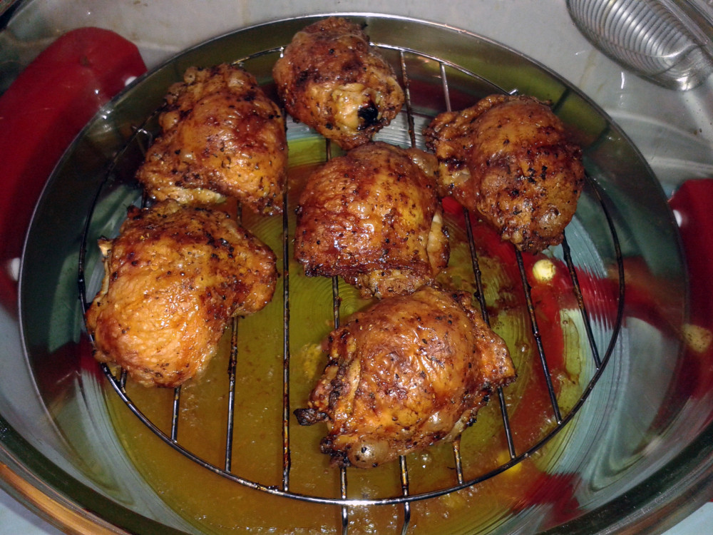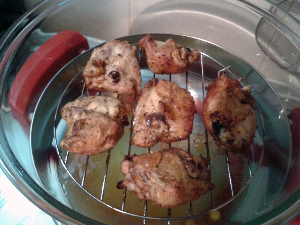 Решила написать и второй отзыв об аэрогриле. После картофеля фри решили приготовить куриные бедра. На ночь замариновала: соль, приправа для шашлыка, много лука, лавровый лист. Перед тем как жарить очистить от лука, будет пригорать (220 градусов, 40 минут, верхняя решетка). На нижнюю решетку нарезать кружками баклажан-1 шт., сладкий перец болгарский-1 шт., посолить, добавить приправы: базелик, хмели-сунели, помешать и выложить на решетку. Через 20 минут перевернуть мясо и овощи, жарить минут 10 обратную сторону и опять перевернуть и до звонка. Все готово! Горячее мясо переложить в другую посуду и посыпать луком, оставшимся в маринаде. Из овощей нарезать салат, добавить свежий помидор, зелень и немного подсолнечного масла. Кто любит, может есть так как есть, не нарезая салатом. На фото приготовление бедер без овощей, это уже на следующий день еще раз жарили. В первый день не догадалась сфотографировать, было гораздо красивей. Решетки после жарки сразу в воду на отмакание, потом легче вымыть. Стекло должно остыть, моется легко. Крышку мыть нельзя, протереть хорошо отжатой тряпкой. Нагреватель не трогать. Ни в коем случае нельзя, чтоб в нагревательный элемент попала вода. После мытья все протереть насухо и только потом закрыть крышкой. Приятного аппетита! Хочу такой же аэрогриль подарить сыну. Спасибо FLIP!