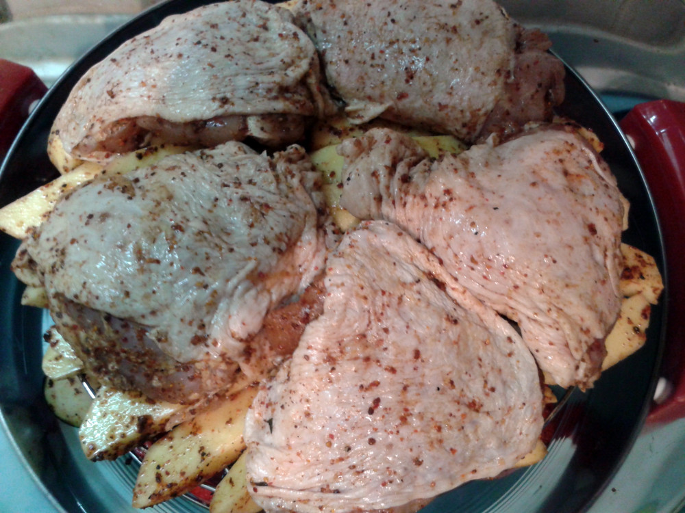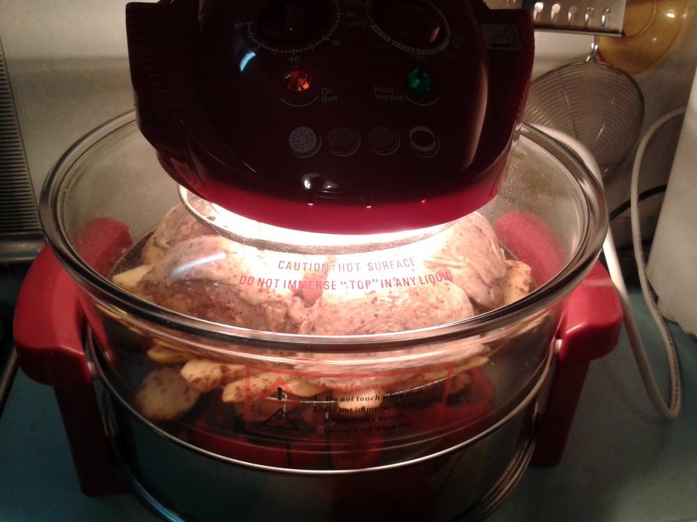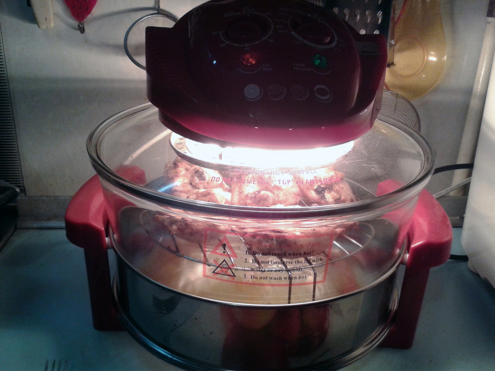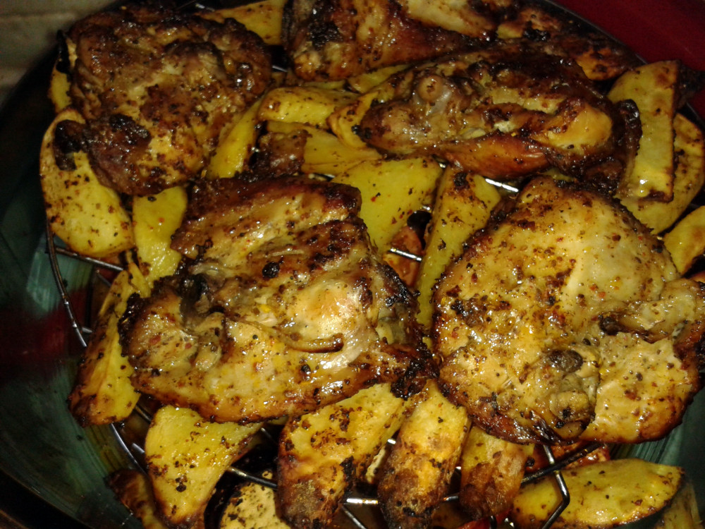 Хочу поделиться уже имеющимся небольшим опытом приготовления в аэрогриле. Если в нем поставить готовить только одно мясо, оно немного пересушивается и уменьшается в размере. Если на нижнюю решетку положить овощи: помидоры, баклажаны, перец, то они дают дополнительное испарение на мясо и оно от этого небольшого пара вздувается, делается красивым и еще более сочным внутри. Картофель лучше порезать толщиной в 1-1,5 см, не толще, и кроме соли и приправ немного капнуть масла и перемешать, а потом уже положить на верхнюю решетку между курицей. Курица готовится 40 минут при самой высокой температуре, а вот картофель после того как снять курицу еще 5 минут.