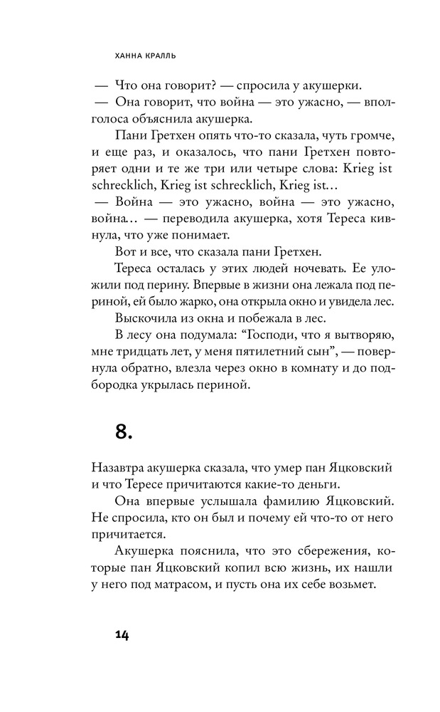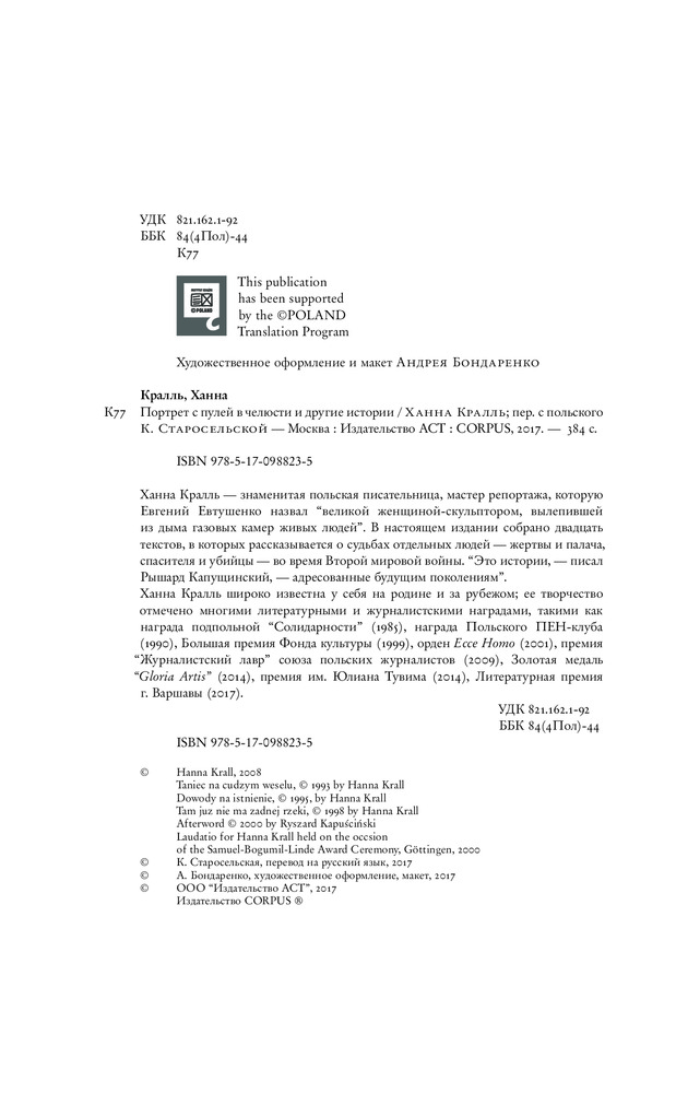 Ханна Кралль, пожалуй, одна из самых известных польских писательниц XX века. Член союза писателей Польши, автор знаменитой книги «Опередить Господа Бога» и воспоминаний о Константине Паустовском, лауреат множества самых престижных литературных и журналистских премий, обладательница многочисленных наград, в том числе наград подпольной «Солидарности» и Польского ПЕН-клуба, ордена Ecce Homo и Золотой медали Gloria Artis. По ее сценариям были сняты фильмы Яна Якуба Кольского «Подальше от окна» и Кшиштофа Кеслёвского «Короткий рабочий день».