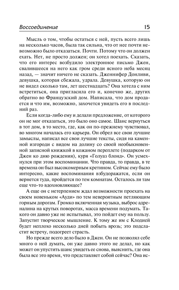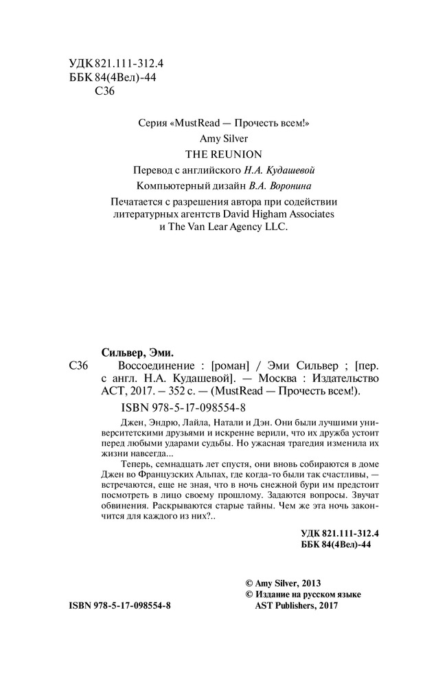 ВоссоединениеВ данный момент этот товар отсутствует в продаже. Возможно, у нас найдется аналогичный или похожий товар здесь. Серия: MustRead - Прочесть всем! «Воссоединение» – пронзительный роман о дружбе, страсти, предательстве и прощении. Шестеро университетских друзей — Конор, Джен, Эндрю, Натали, Лайла и Дэн — были молоды и беспечны, любили друг друга, делились секретами, радостями и переживаниями. Но когда в аварии погибает Конор, ни о какой прежней жизни не может быть и речи. За рулем тогда был Эндрю, но груз вины давит на всех. Раны и обиды рубцуются, но не забываются. Спустя семнадцать лет их вновь объединит дом, где они были когда-то так счастливы. И друзьям придется заново учиться доверять, слушать и ценить друг друга. |