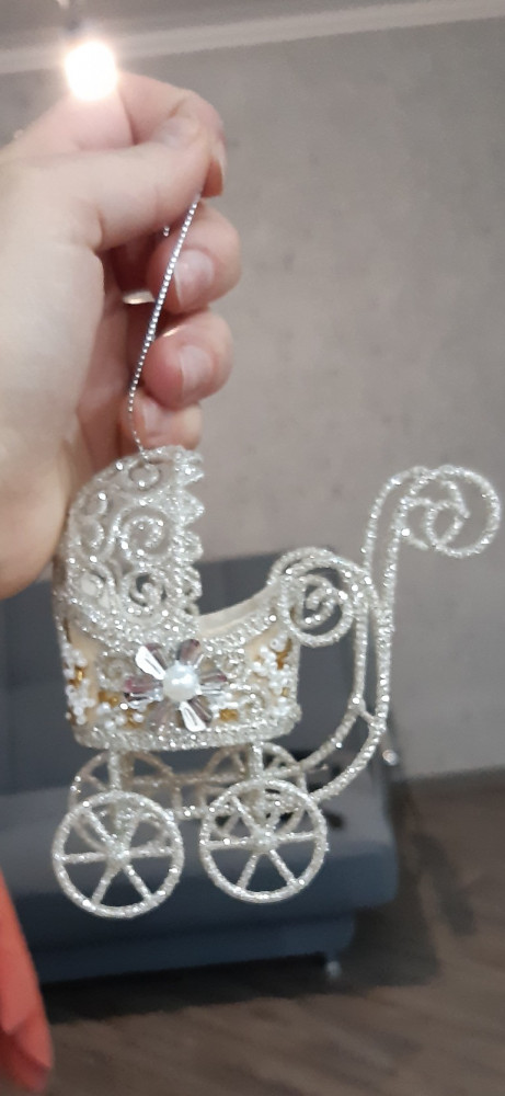 Товаром очень довольна. Взяла как символ для своей молодой семьи) Необычайной красоты изделие. Неописуемая красота. И колясочка то большая на елке не затеряется! Товаром безумно довольна!!! Ставлю 5!!!! Супер!!!! Данная вещь этих денег стоит!