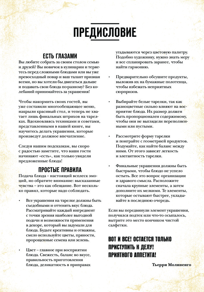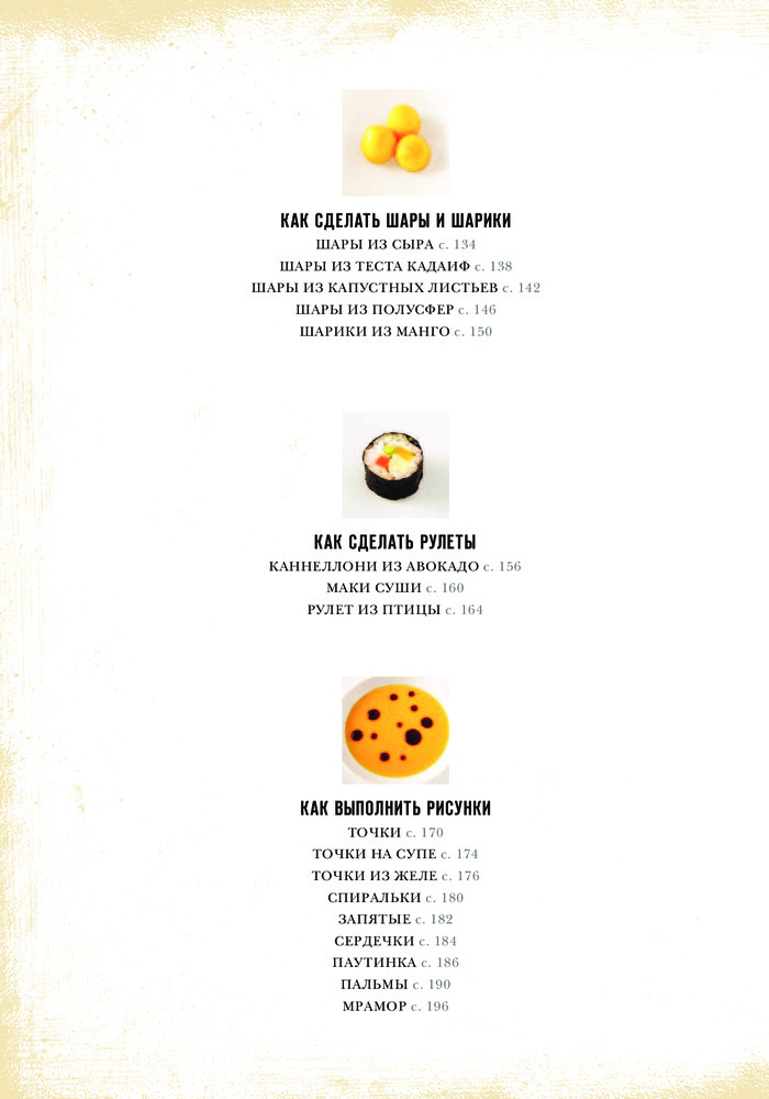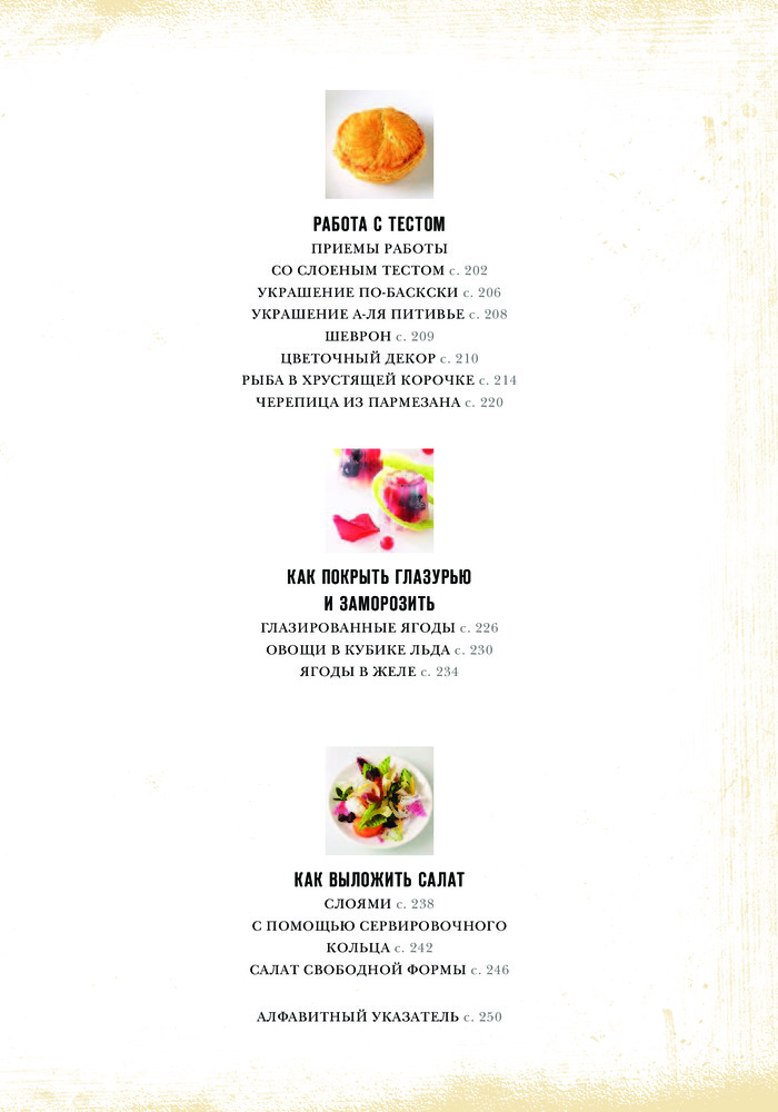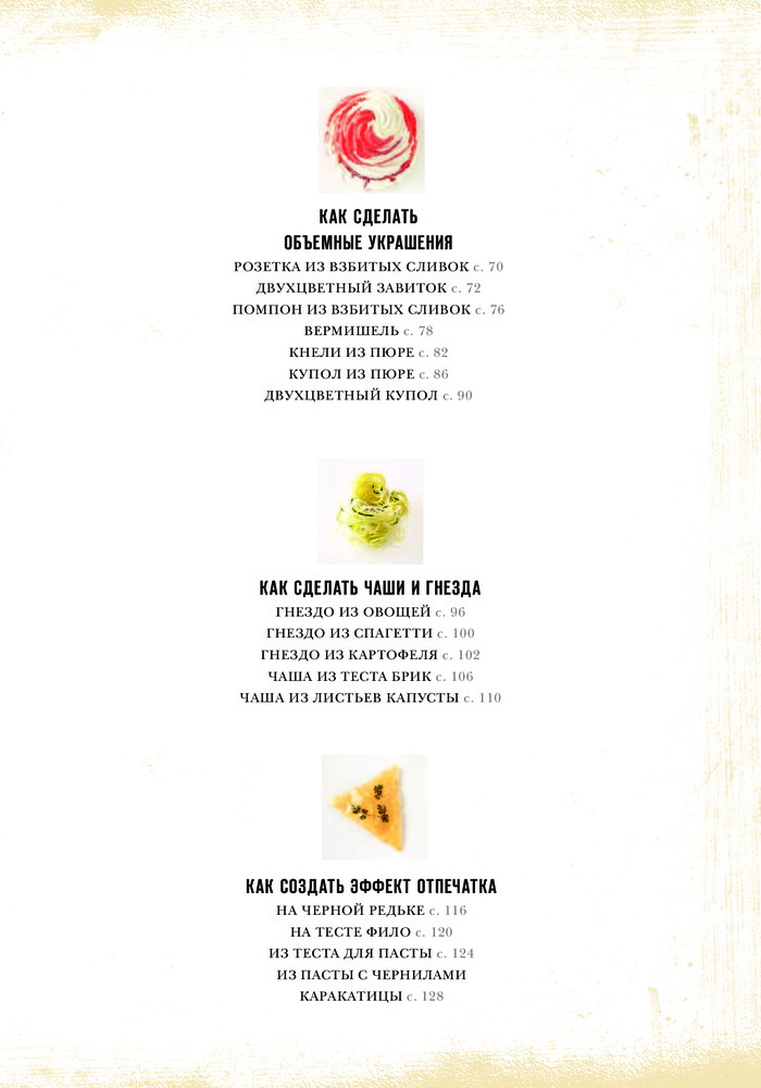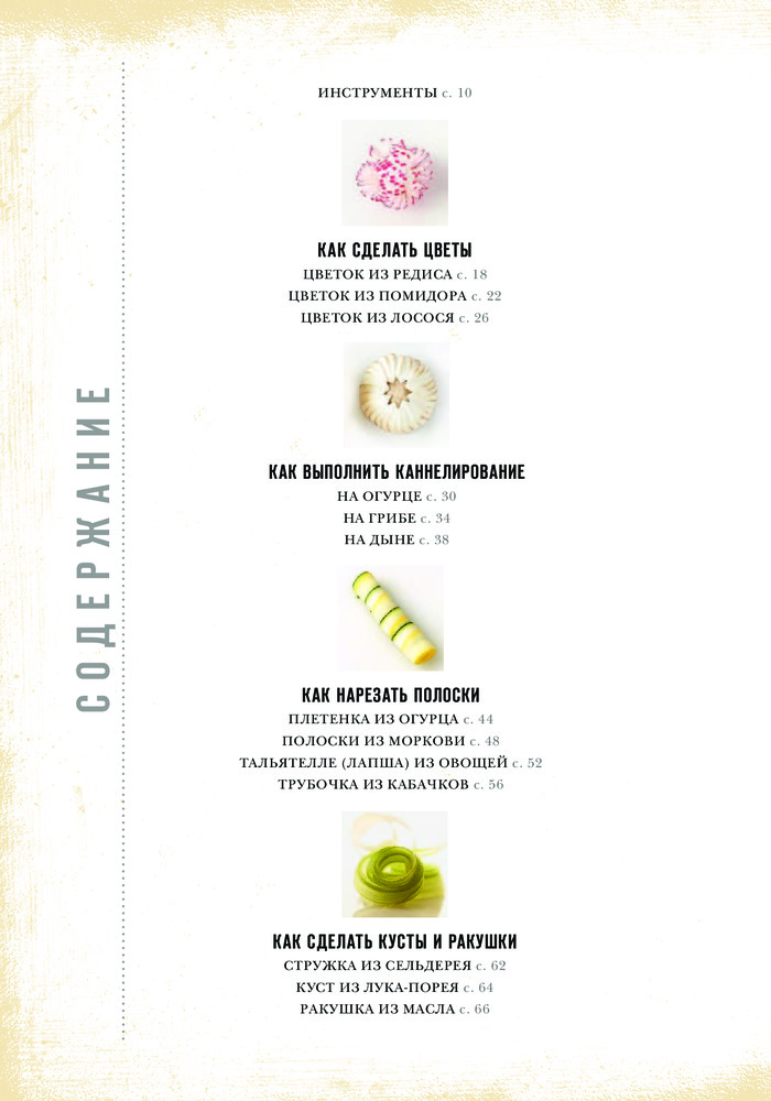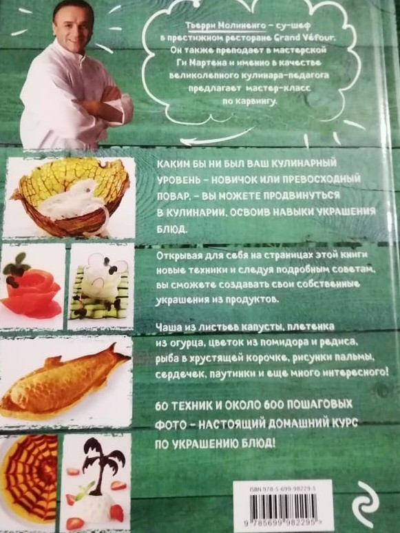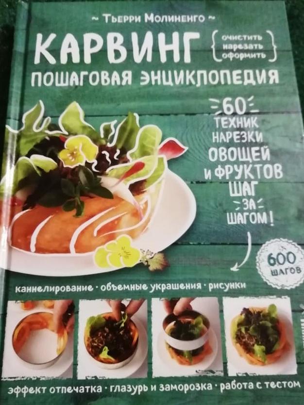 Книгу приобрела давно. Она очень полезна для тех, кто любит украшать и красиво подавать свои блюда. Вначале даны фото нужных инструментов с описанием. Далее подробные мастер - классы с фотографиями. Содержание: как сделать цветы, кусты и ракушки, объемные украшения, чаши и гнезда, эффект отпечатка, шары и шарики, рулеты, рисунки. Кроме этого как правильно нарезать для украшения, покрыть глазурью и заморозить, как выложить салат. Очень полезная глава работы с разным тестом. Книга красочная. Страницы белые из плотной бумаги. Гладкая, яркая обложка.