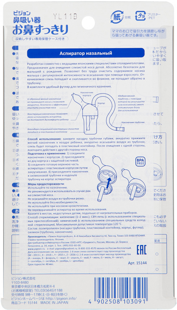 Лучший аспиратор назальный, который был у нас это Bebe Confort, но из-за невозможности купить на сегодняшний день, приобрели Pigeon, очень приближен по использованию к нему, мягкий силиконовый наконечник не травмирует, расположение корпуса и самой трубки сделано хорошо.