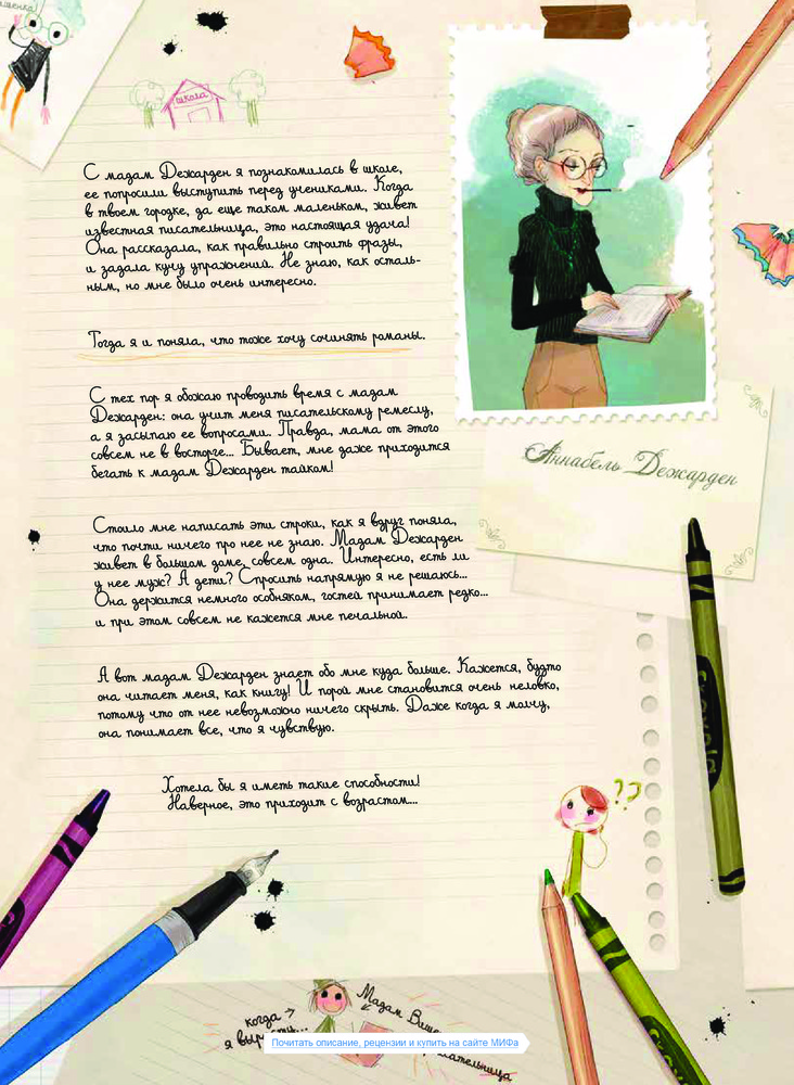 Нежная и красивая история в формате дневника, начинающей писательницы. Я считаю, эта книга должна быть у каждой девочки 8-12 лет. Она о дружбе, о любви к своей семье и к своей работе. Она о настоящих чувствах вне экрана телевизора.