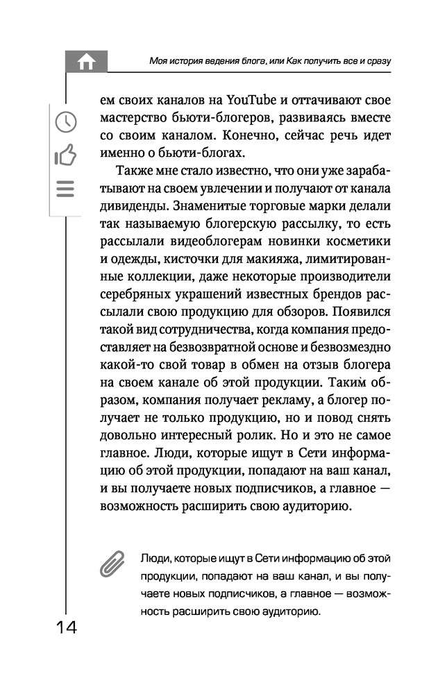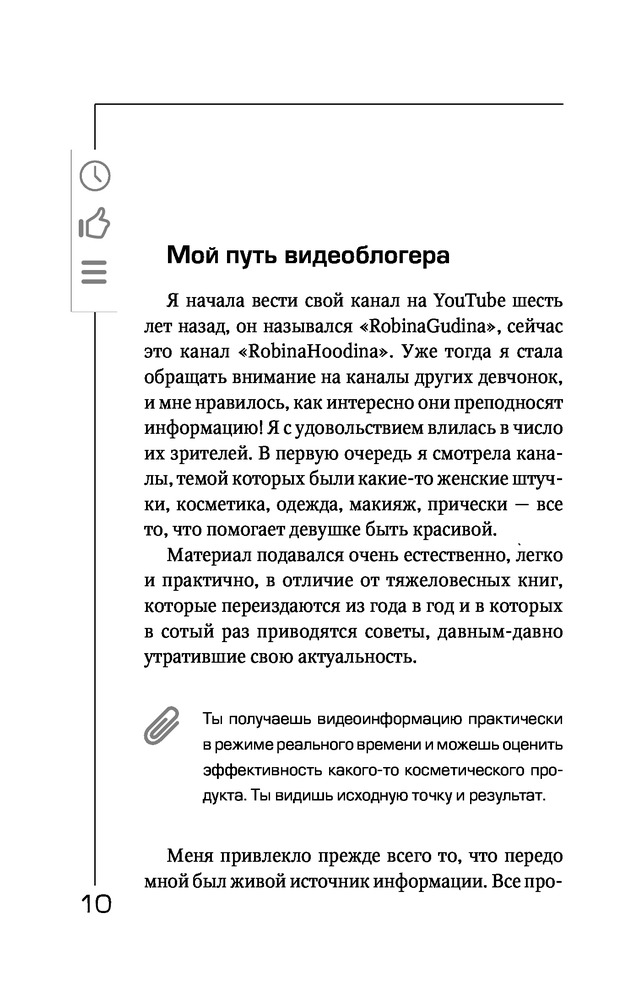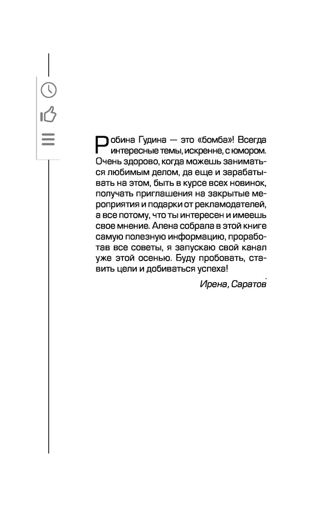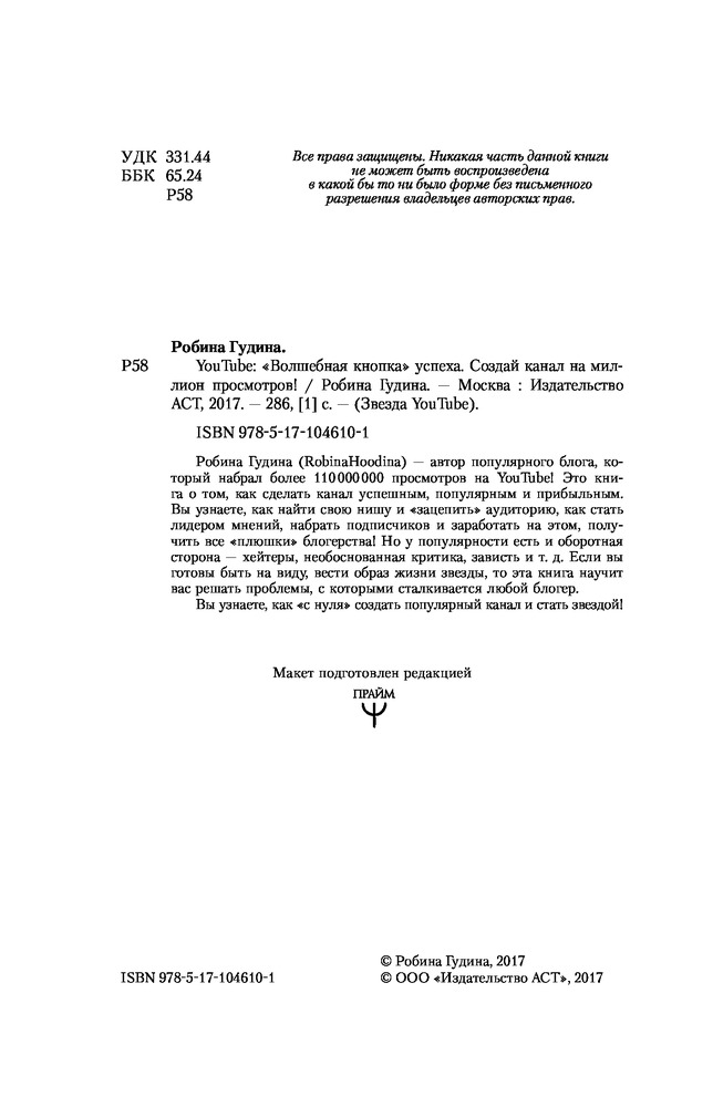 YouTube: «Волшебная кнопка» успеха. Создай канал на миллион просмотров!В данный момент этот товар отсутствует в продаже. Возможно, у нас найдется аналогичный или похожий товар здесь. Робина Гудина (RobinaHoodina) – автор популярного блога, который набрал более 110 000 000 просмотров на YouTube! Это книга о том, как сделать канал успешным, популярным и прибыльным. Вы узнаете, как найти свою нишу и «зацепить» аудиторию, как стать лидером мнений, набрать подписчиков и заработать на этом, получить все «плюшки» блогерства! Но у популярности есть и оборотная сторона – хейтеры, необоснованная критика, зависть и т.д. Если вы готовы быть на виду, вести образ жизни звезды, то эта книга научит вас решать проблемы, с которыми сталкивается любой блогер. |
