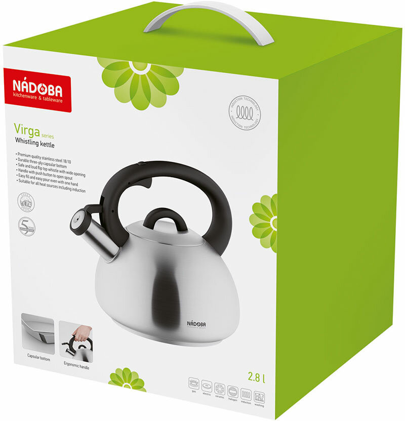Nadoba Чайник со свисткомкачественный приятный дизайн удобный объём громкий свисток В данный момент этот товар отсутствует в продаже. Возможно, у нас найдется аналогичный или похожий товар здесь. Серия: Virga Чайники серии Virga производится из нержавеющей стали марки 18/10. Трехслойное капсульное дно изделия которое помогает равномерному распределению тепла по всей площади посуды. Широко открывающийся кнопкой громкий носик позволяет наполнять чайник через носик, не открывая при этом крышку, и вовремя проинформирует о готовности. Удобная не нагревающаяся ручка позволяет воспользоваться чайником с помощью одной руки. Подходит для любого типа плит. |