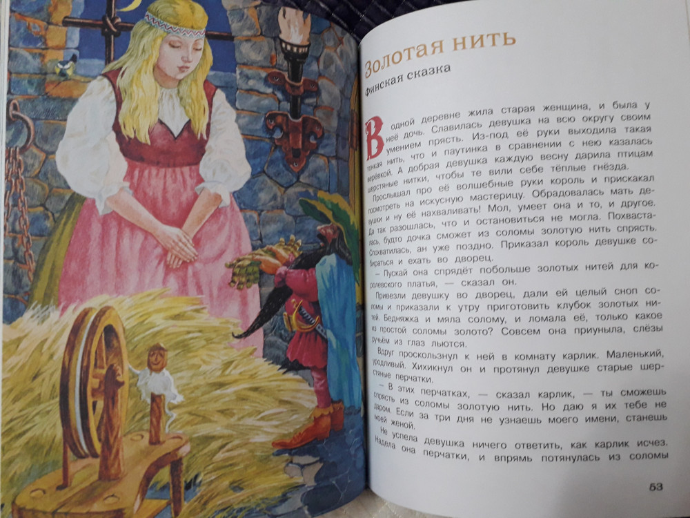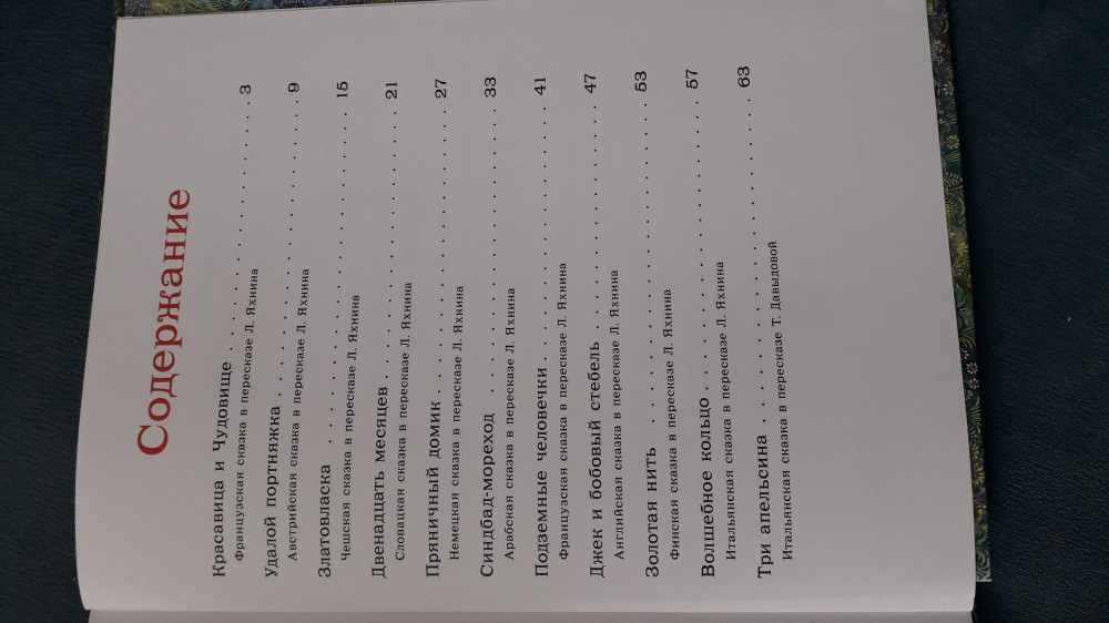 Книга очень хорошая. Включает 12 сказок: "Красавица ми чудовище", "Удалой портняжка", "Златовласка", "12 месяцев", "Золотая нить", "Пряничный домик", Волшебная книга", Синдбад-мореход", "Подземные человечки", "Волшебное кольцо", Джек и бобовое зёрнышко", Три апельсина". Все сказки - авторов разных стран. Художники - разные. Поэтому есть рисунки на тройку (*например "Синдбад-мореход", "Волшебное кольцо" просто наляпаны,иначе не скажешь). НО есть и отличные добросовестно выполненные рисунки. Но в целом книга стоит того, чтобы её купить! Мы довольны.