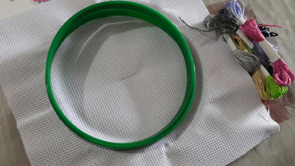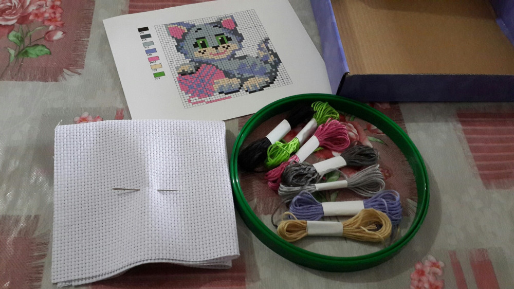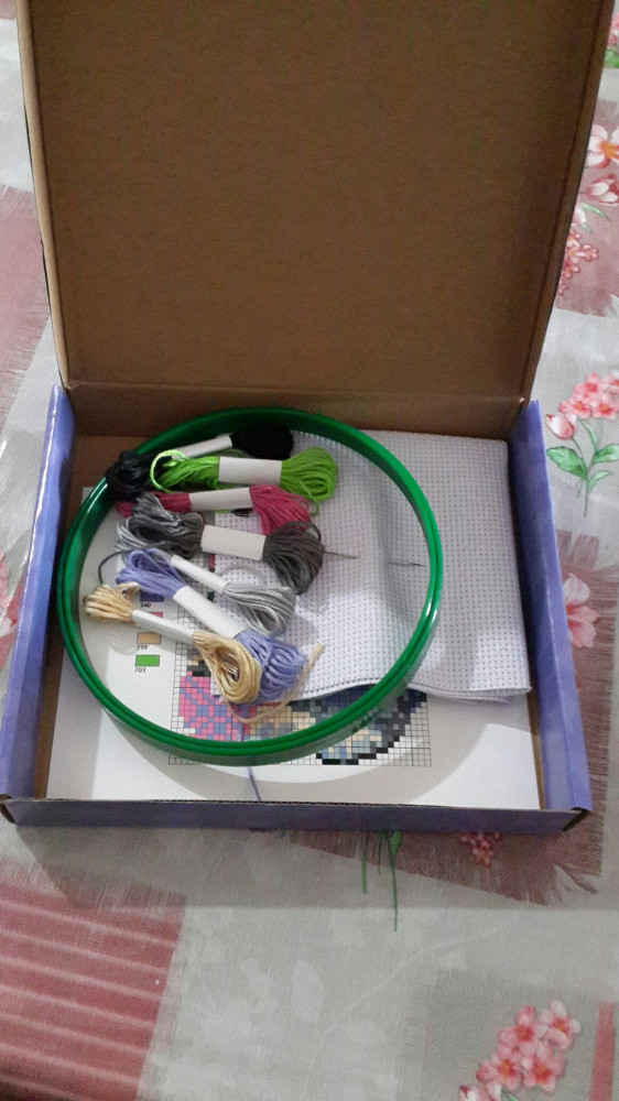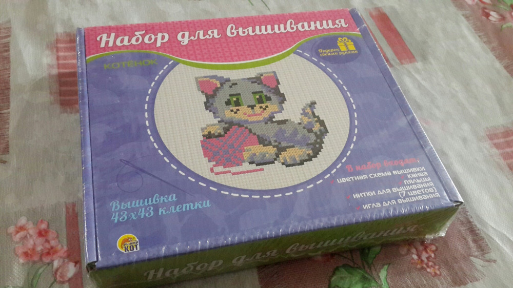 Набор хороший, взяла дочке. Внутри есть всё, как и указано, но пяльцы какие то тугие, в общем с пяльцами возились долго, так и не смогли закрепить туда канву. Будем использовать другие пяльцы здесь.