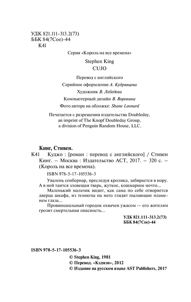 Куджо вышел в 1983 году. Стивен Кинг вдохновился романом когда вовремя прогулки в парке напал плохо воспитанный сенбернар после этих событий было написан сам роман во время написания Кинг страдал от наркотической зависимости поэтому про написание ничего не помнит а когда его спрашивают он отвечает: "Меня просто занесло". Куджо связан с другим романом а именно Мертвая зона поэтому желательно после или до прочтения Куджо ознакомиться и с Мертвой зоной.