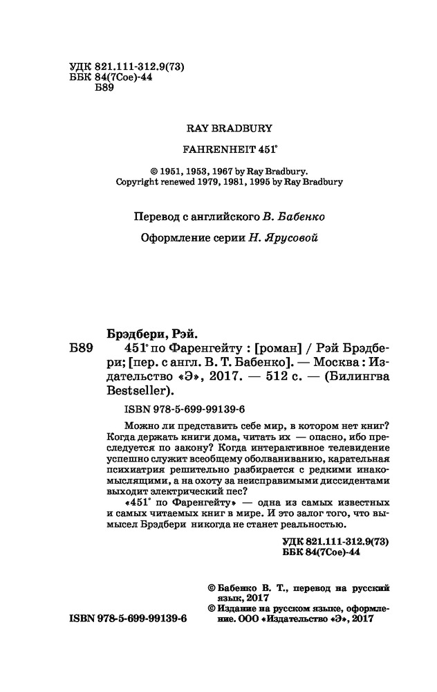 451' по ФаренгейтуВ данный момент этот товар отсутствует в продаже. Возможно, у нас найдется аналогичный или похожий товар здесь. Серия: Билингва Bestseller Можно ли представить себе мир, в котором нет книг? Когда держать книги дома, читать их — опасно, ибо преследуется по закону? Когда интерактивное телевидение успешно служит всеобщему оболваниванию, карательная психиатрия решительно разбирается с редкими инакомыслящими, а на охоту за неисправимыми диссидентами выходит электрический пес? |