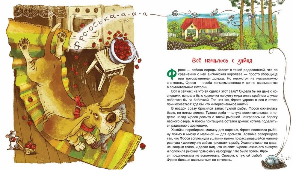 Отлична книга! Твердый переплет, яркие интересные картинки.Главная героиня книги - собака породы бассет, по имени Фрося. Она веселая, чуточку легкомысленная и вечно ввязывается во всякие истории, о которых интересно прочитать детям и взрослым. Веселые истории, никого не оставят равнодушными.Рекомендую.