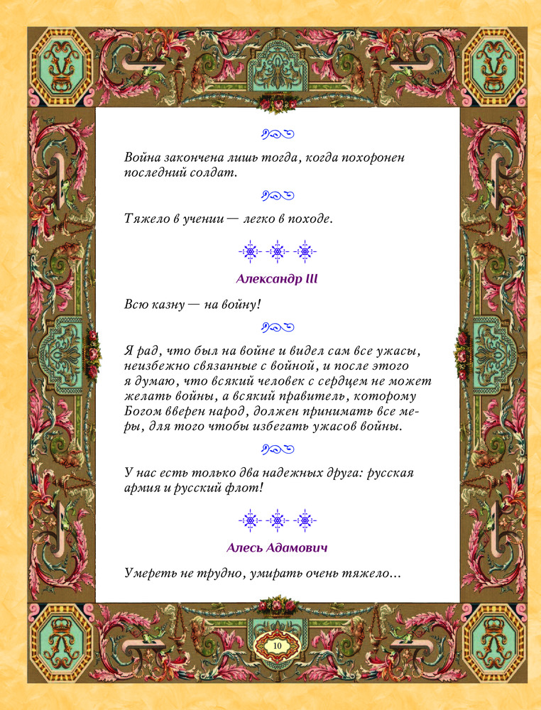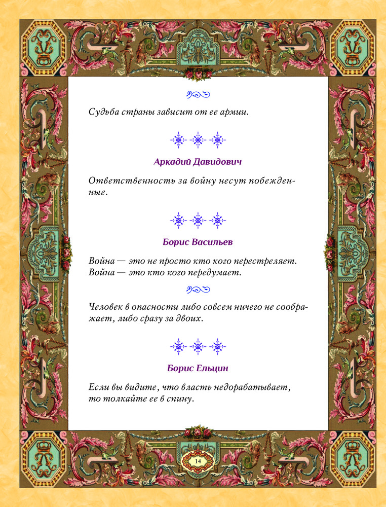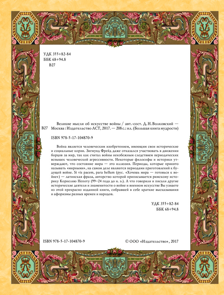 💳 Оплатить за товар можно при получении 🇰🇿 Есть бесплатная доставка по Казахстану от 1 дня 🎁 Копите бонусы с каждой покупки Война является человеческим изобретением, имеющим свои исторические и социальные корни. Зигмунд Фрейд даже отказался участвовать в движении борцов за мир, так как считал войны неизбежным следствием периодических вспышек человеческой агрессивности. Некоторые философы и историки утверждают, что состояние мира — это иллюзия. Периоды, которые принято называть «мирными», на самом деле являются периодами приготовлений к будущей войне. Si vis pacem, para bellum (рус. «Хочешь мира — готовься к войне») — латинская фраза, авторство которой приписывается римскому историку Корнелию Непоту (99–24 года до н.э.). А что говорили и писали другие исторические деятели и знаменитости о войне и военном искусстве Вы узнаете из этой прекрасно изданной книги, собравшей в себе краткие высказывания |
