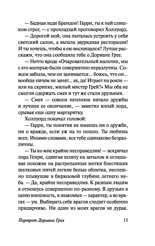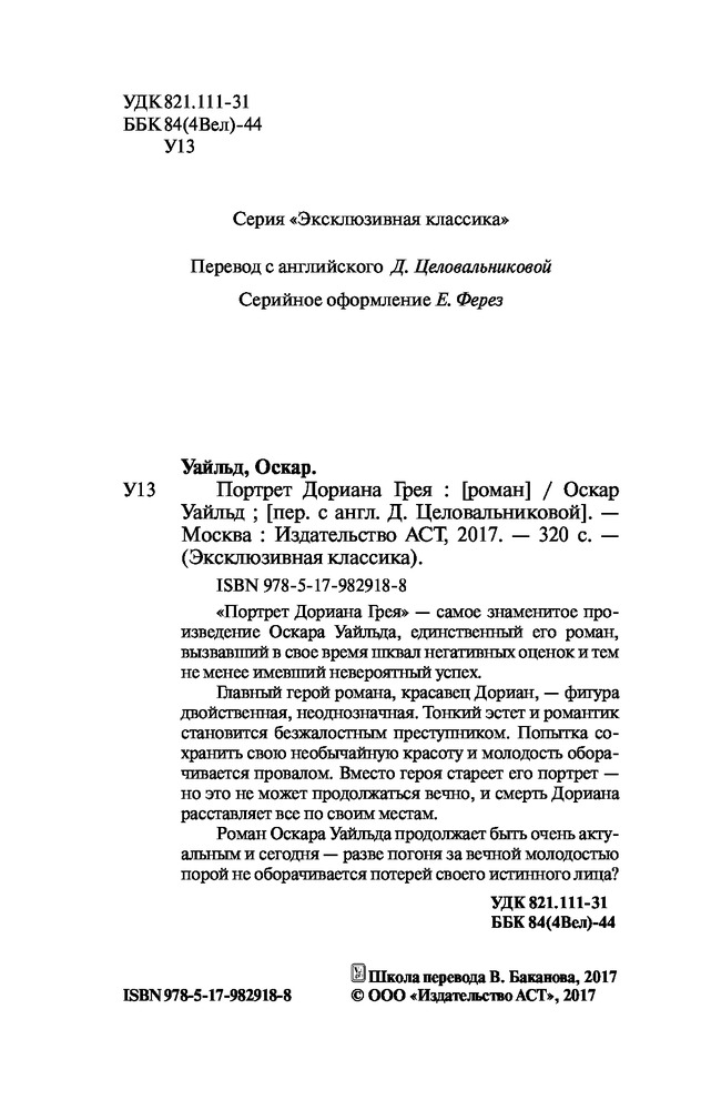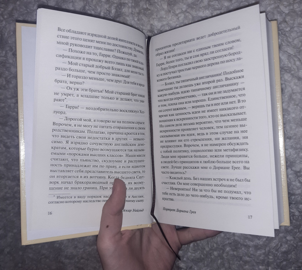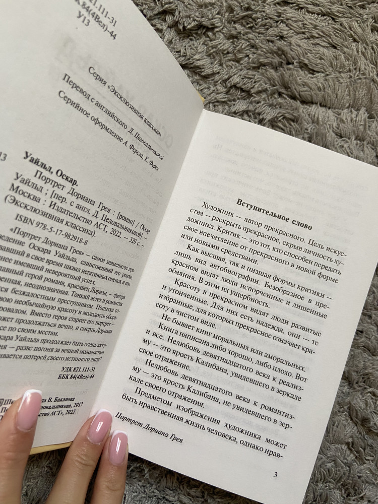 Книга пришла в идеальном состоянии, визуально очень нравится 👍🏻 Теперь о содержании: прочитала на одном дыхании за ~4 дня, не могла оторваться. И здесь дело не только в интересном сюжете и множестве интересных цитат, но так же и в самом слоге. Очень красиво написано, как минимум из-за этого мне хочется ее перечитать. Книга произвела настолько мощное впечатление, что вот уже несколько дней я не могу читать что-то другое. Однозначно рекомендую. P.s. Единственное, что не понравилось, это частые сексисткие высказывания Лорда Генри в сторону женщин, которые выбесили меня даже больше, чем 11 глава)) печально, что находятся люди, воспринимающие их за чистую истину