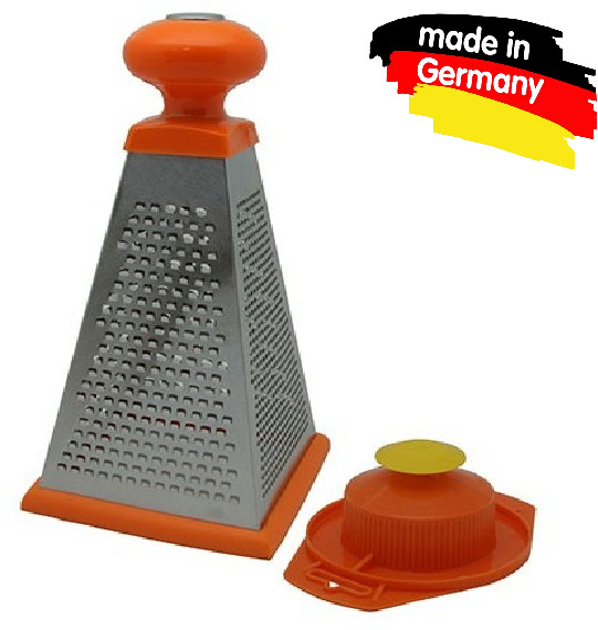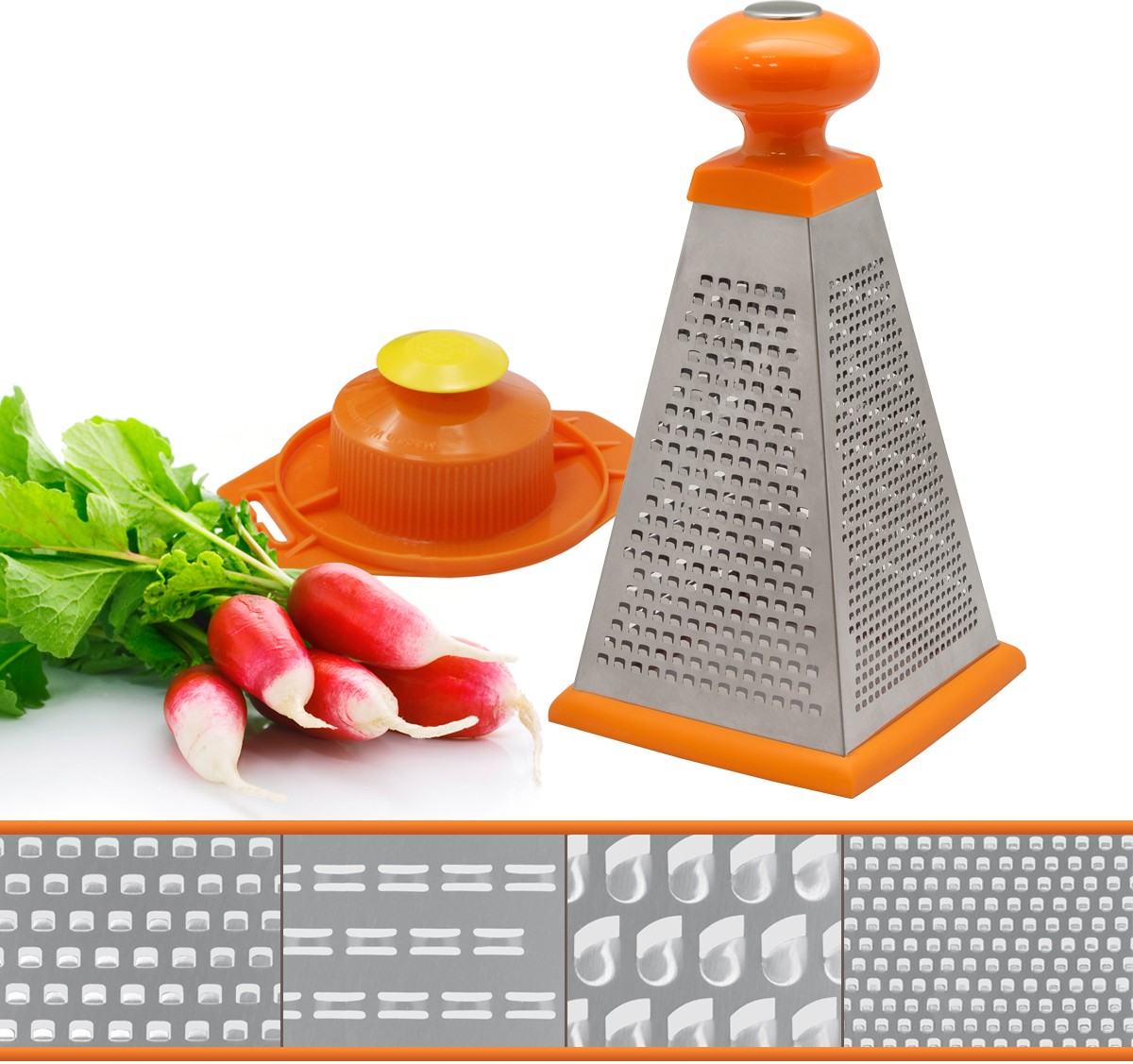 Четырехгранная металлическая терка имеет 4 стороны с разными формами ножей, что позволяет натирать четырьмя разными способами — от мелкой крошки и нежного пюре, до средней нарезки и крупной стружки, как сырые продукты, так и варёные овощи.