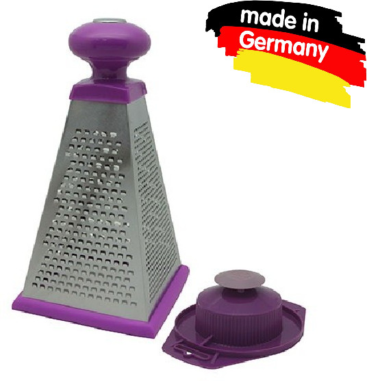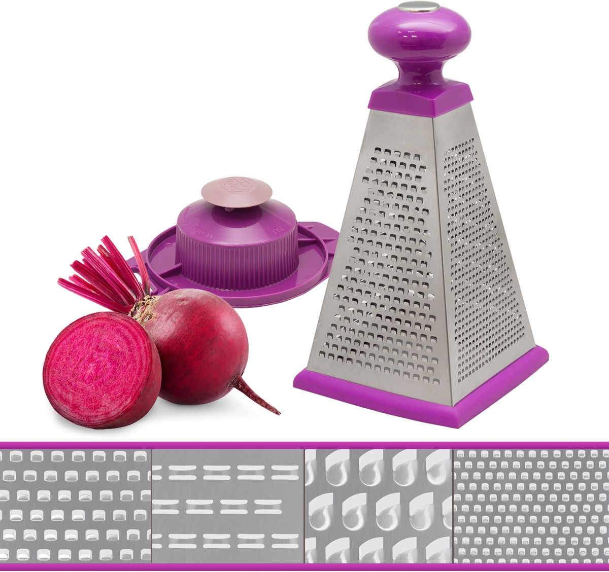 Четырехгранная металлическая терка имеет 4 стороны с разными формами ножей, что позволяет натирать четырьмя разными способами — от мелкой крошки и нежного пюре, до средней нарезки и крупной стружки, как сырые продукты, так и варёные овощи.