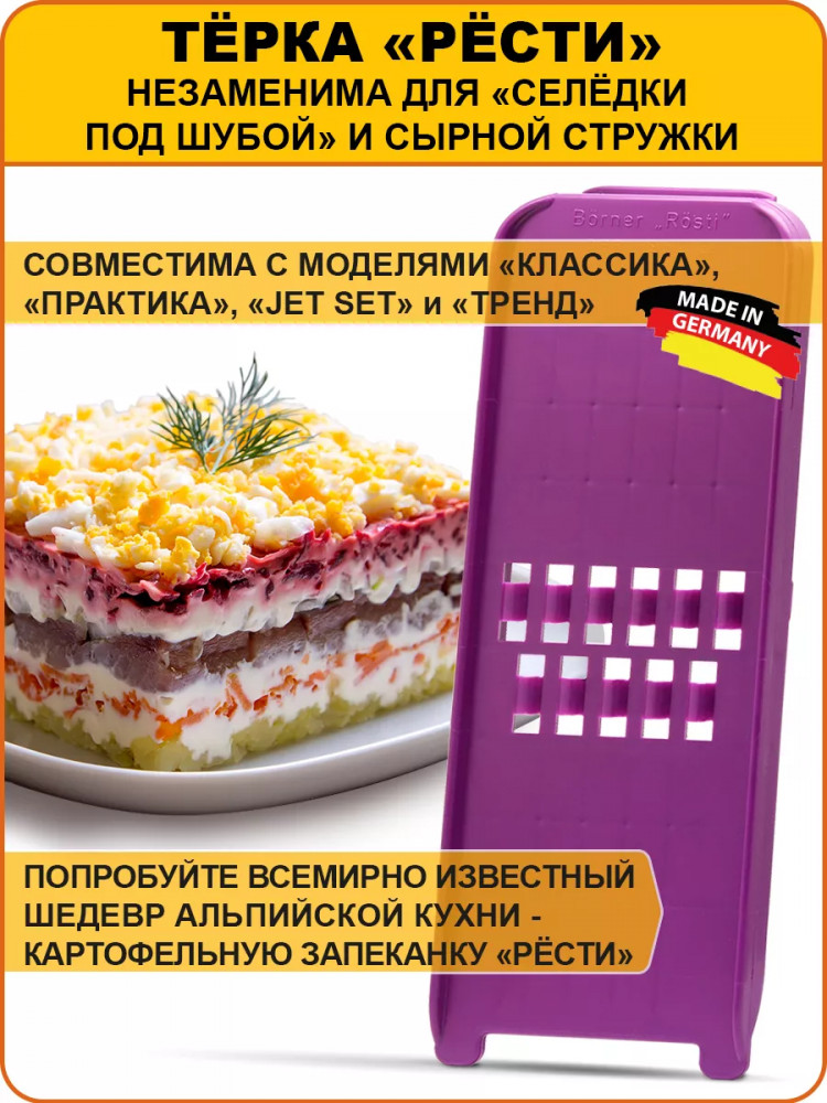 Прекрасная терка, как и все этой фирмы. Я ее использую для вареных овощей. Особенно для картофеля.