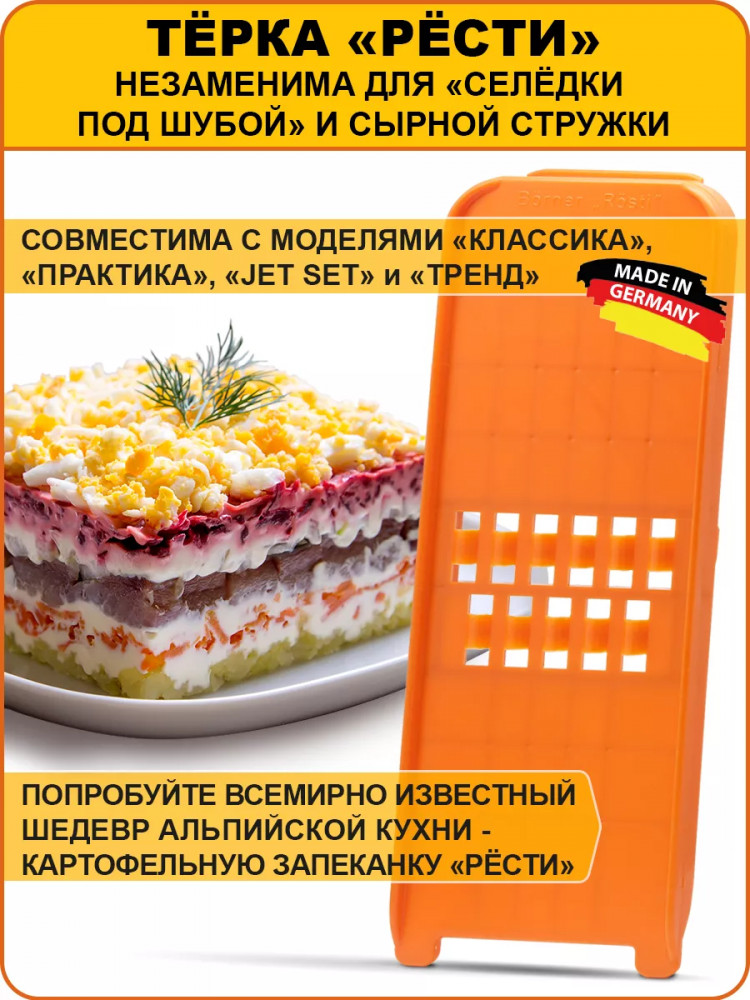 Думала размер прохода будет побольше, чем у обычных. Но, увы, все то же самое. Правда, морковь хоть не застревает, но очень мелко получается. Спасибо. Жаль, что эта терка, единственная из терок Бергера, не порадовала. Слишком поздно взялась ее испытывать, прошел срок возврата.