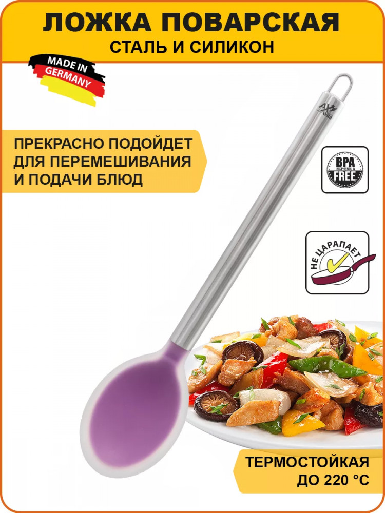 Ложка очень понравилась, пользуюсь с удовольствием! Длинная ручка, приятно держать в руке. Силиконовая ложка не царапает поверхность кастрюлек и сковородок. Рекомендую!