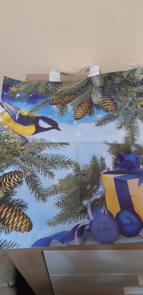 Прекрасный пакет, в котором можно преподнести зимний презент, с изображением синички, которая доставщиком, была повышена в должности, до пингвина)))) Вспоминаю и хохочу)))) С такой подачей, пакет, очень нравится)))) Рекомендую. Спасибо, Флип.кз.