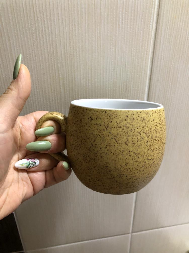 Кружка точно такая как на фото. Хорошо легла в руке, удобна. По размеру небольшая. Кажущаяся шершавость материала ошибочна, кружка гладкая (не глянцево-гладкая, а матово-гладкая). Для удобства привожу фото (у меня рука средняя)