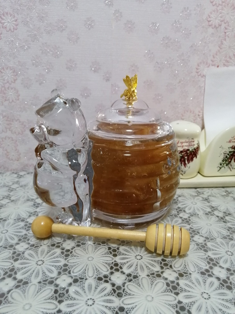 Замечательная баночка, немного тяжеловата, но это скорее говорит о прочности, на подарок будет идеально и на своём столе смотрится эффектно. Даже начали кушать мед))