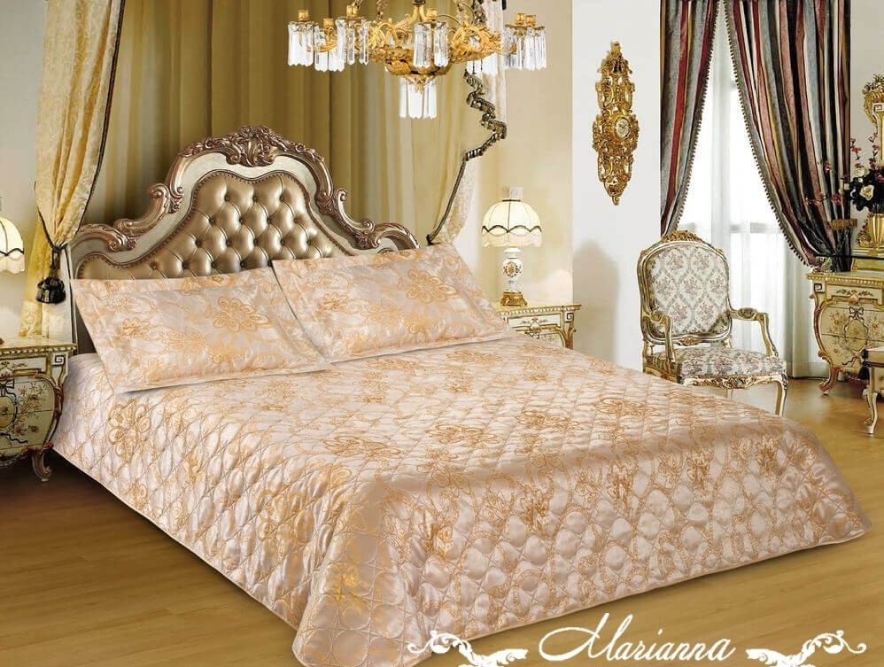 Стеганое покрывало из жаккарда и две наволочки, украшенные нежным узором.