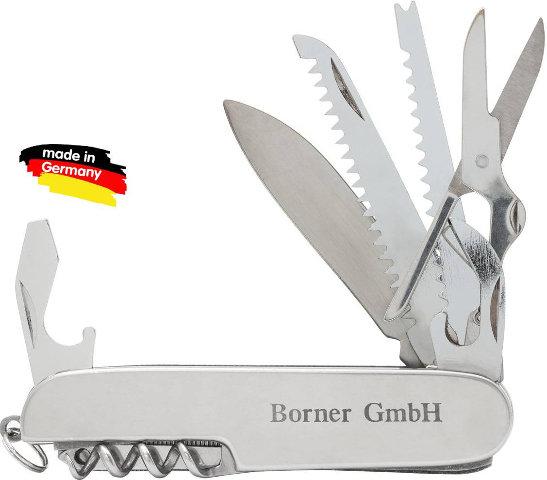 Bőrner Нож перочинный «Швейцарский»В данный момент этот товар отсутствует в продаже. Возможно, у нас найдется аналогичный или похожий товар здесь. Перочинный нож незаменим в походах и путешествиях и ценится прежде всего своей универсальностью. Этот компактный предмет объединяет в себе нож, штопор, пилу, ножницы, открывалку и другие необходимые в быту инструменты. Все составляющие этого ножа легко сворачиваются, для этого не нужно принимать больших усилий. Металлический корпус обладает не только декоративной функцией, но и отличается высокой прочностью. Швейцарский нож от бренда Borner — просто находка для любого мужчины. Небольшие размеры позволяют носить устройство всегда с собой (в кармане или в сумке). |