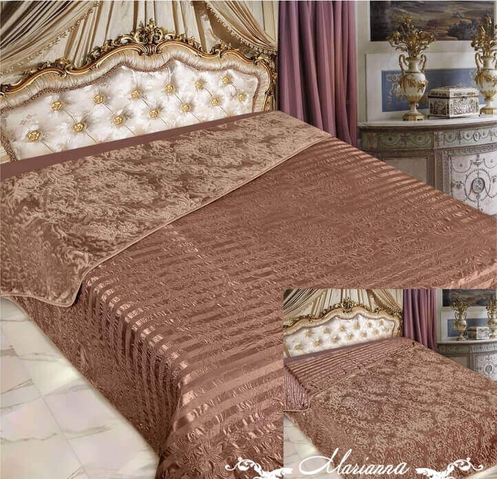 Покрывало понравилось. Смотрится в спальне хорошо. Можно стелить на кровать любой стороной. Советую купить.