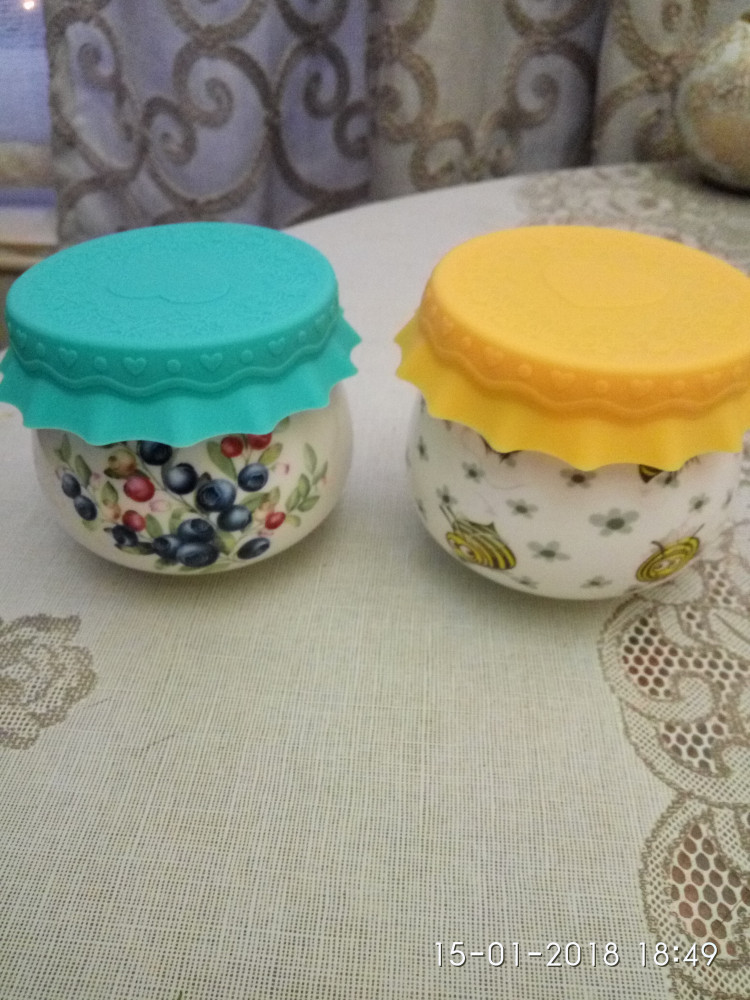 Очаровательные и удобные баночки с яркими силиконовыми крышками, которые сохраняют вкус и свежесть продуктов, а также украшают стол. Приобрела их несколько разных объемов для подачи варенья, меда, джема и даже сметаны. Родственникам Дед Мороз в подарок принес. Все довольны!