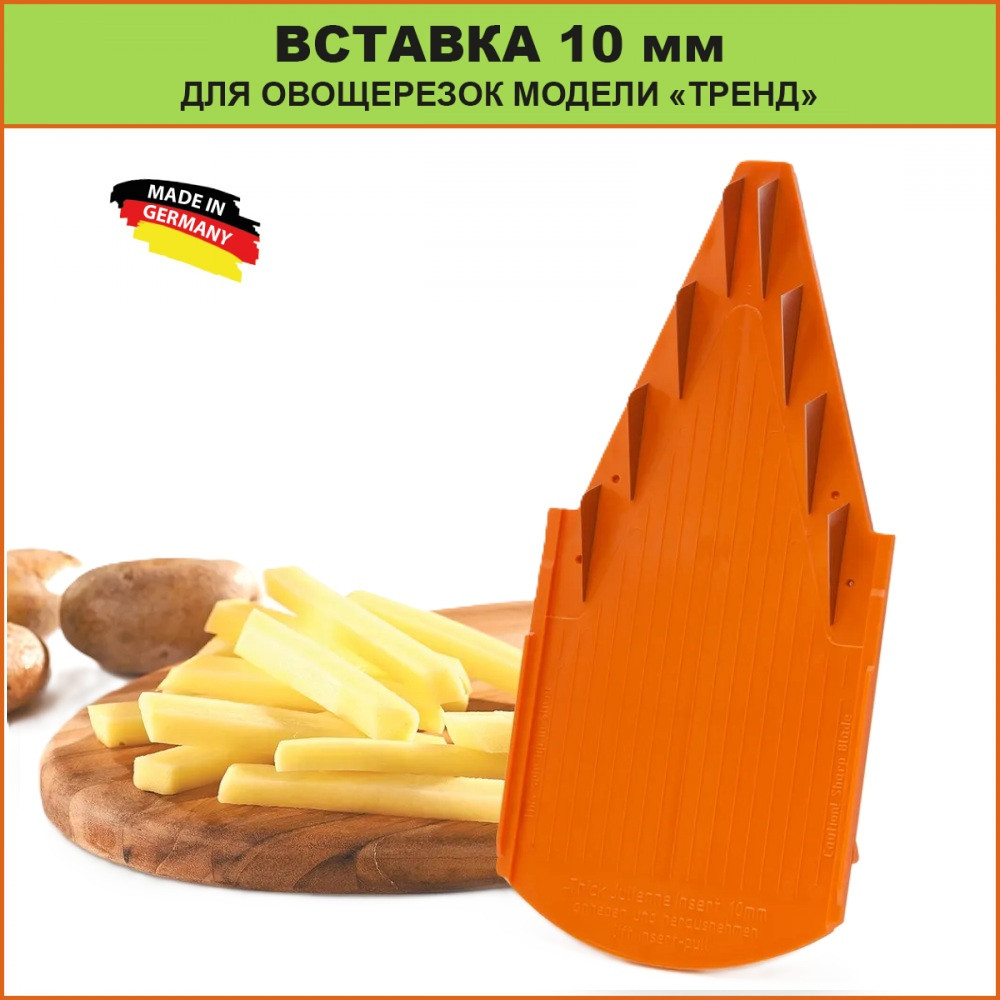 Хорошая вставка. На тренд плюс подходит. Трет на ура. 2 мин и кол-во картошки на большую сковородку для жарки готово! Получается чуть крупнее-толще чем на вставке которая идет в комплекте 7,5мм. Но мне для жарки нравится именно на этой терке 10мм, а вот на 7,5 для меня немного тонковата для жарки и подходит больше для фри. Хотя вкусно и то и то получается. Но это сугубо мое субъективное мнение. Вкусы у всех разные.Ножи очень острые. Режут как по маслу. Качество как и у всей продукции Бернер на высоте.