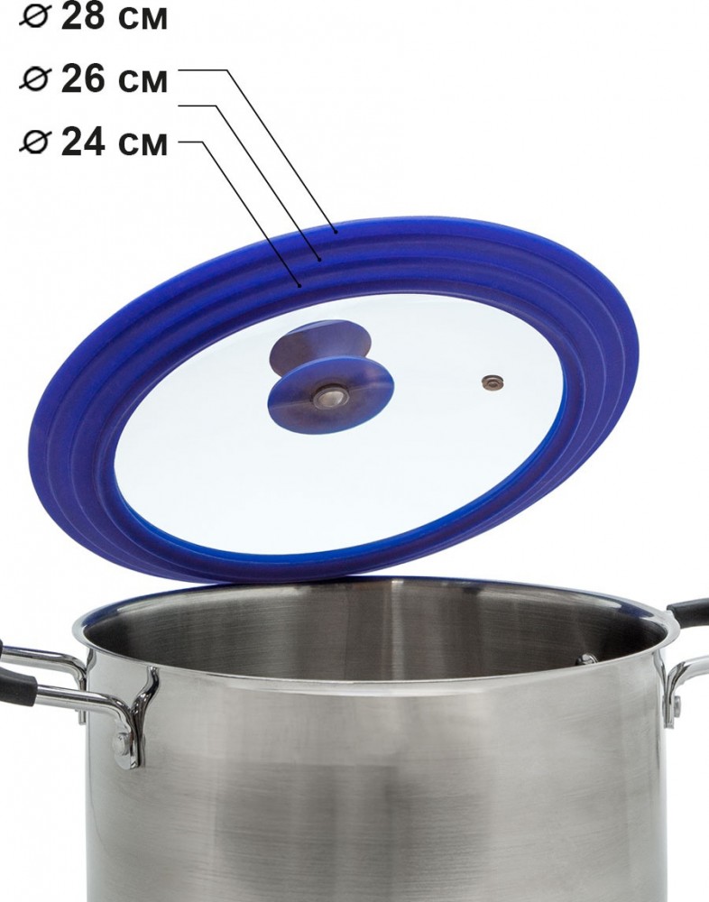 Крышка супер!!! Действительно на три размера кастрюль подходит. Силиконовый ободок очень плотно прилегает. Имеется отверстие для выхода пара.